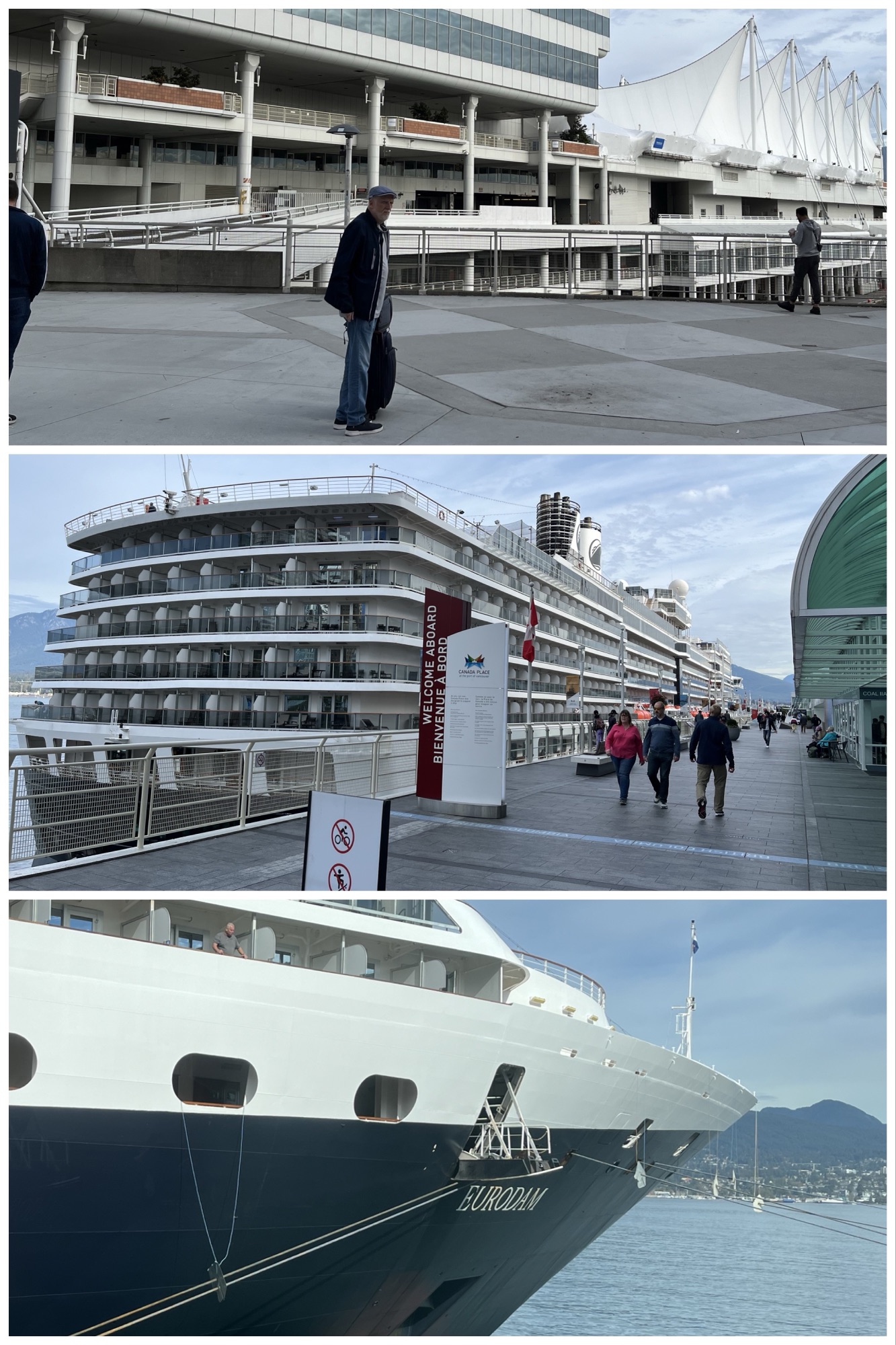 We’ve sailed with Holland America twice before, both times on the MS Koningsdam, a Pinnacle class ship launched in 2015, refurbished in 2023, and holding 2650 passengers. This time we’re on the older MS Eurodam, a Signature class ship launched in 2008, last refurbished in 2018, and able to carry just 2100 passengers (and it’s not at capacity this trip). In general, Ted and I prefer smaller ships, as long as there are still good amenities offered. The Eurodam has one less live music venue, and two fewer specialty restaurants, plus no Grand Dutch Café, which was our go-to specialty coffee spot, but still lots to do and see. And after all, it’s all about the itinerary, plus the bonus of being able to sail out of Vancouver.