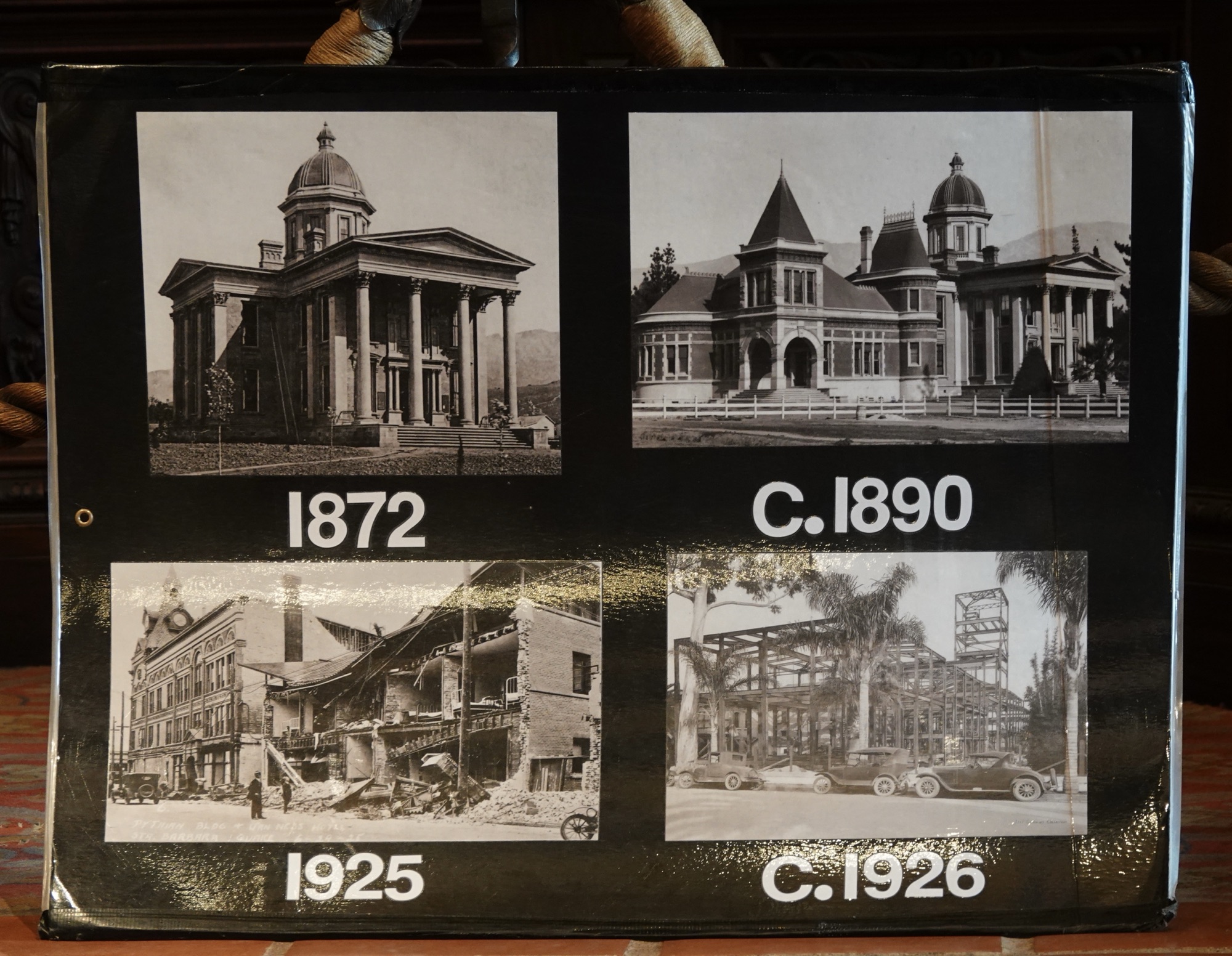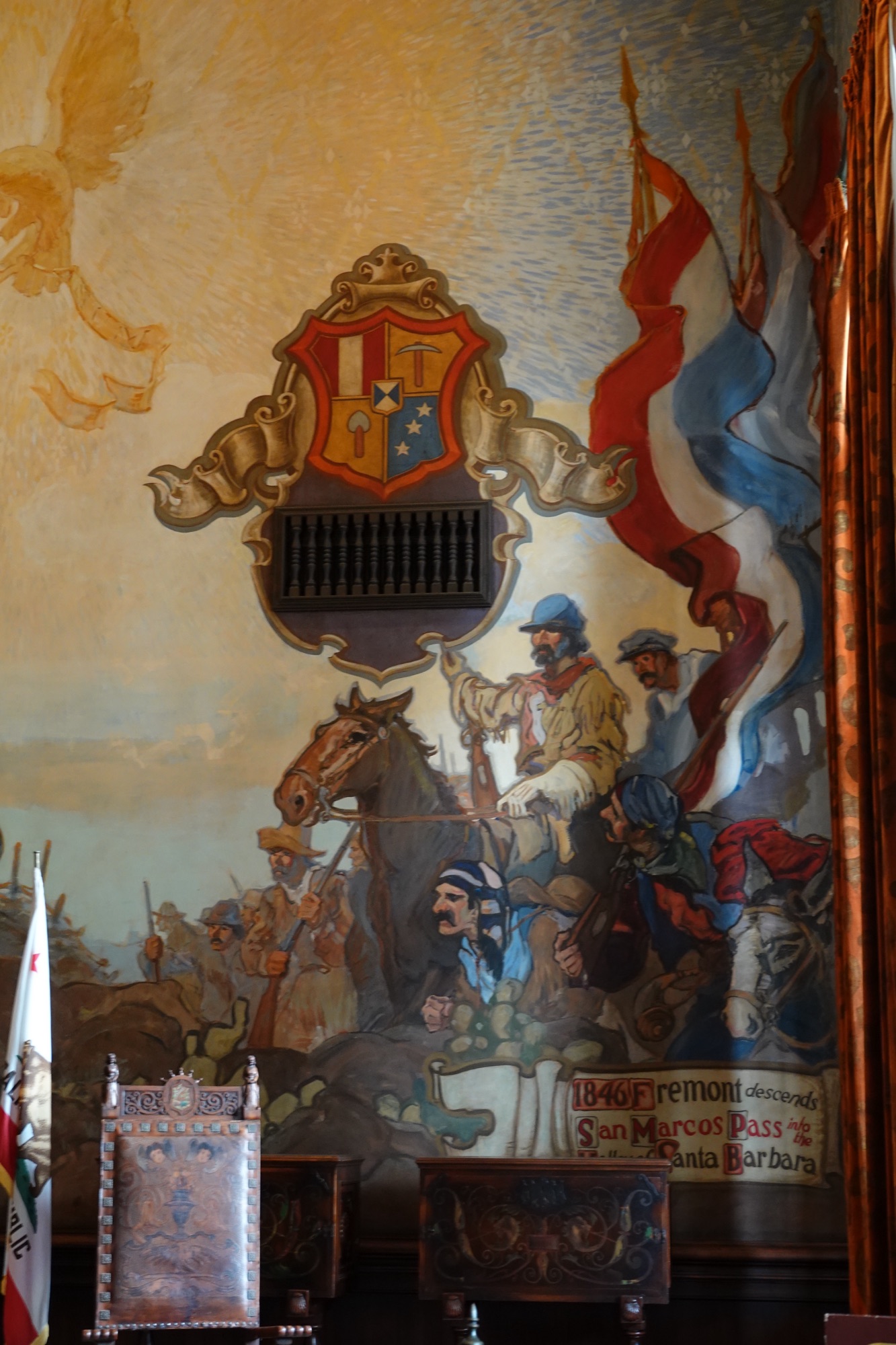 The murals in the courthouse represent Santa Barbara’s history from Canaliño tribal times through Cabrillo arriving in CE1542, 50 years after Columbus and all the way up to 1846 when Fremont descended the San Marco Pass during the Mexican American war. He brought the American flag, which supplanted the Mexican flag that had been flying since California became a Mexican territory in 1822.