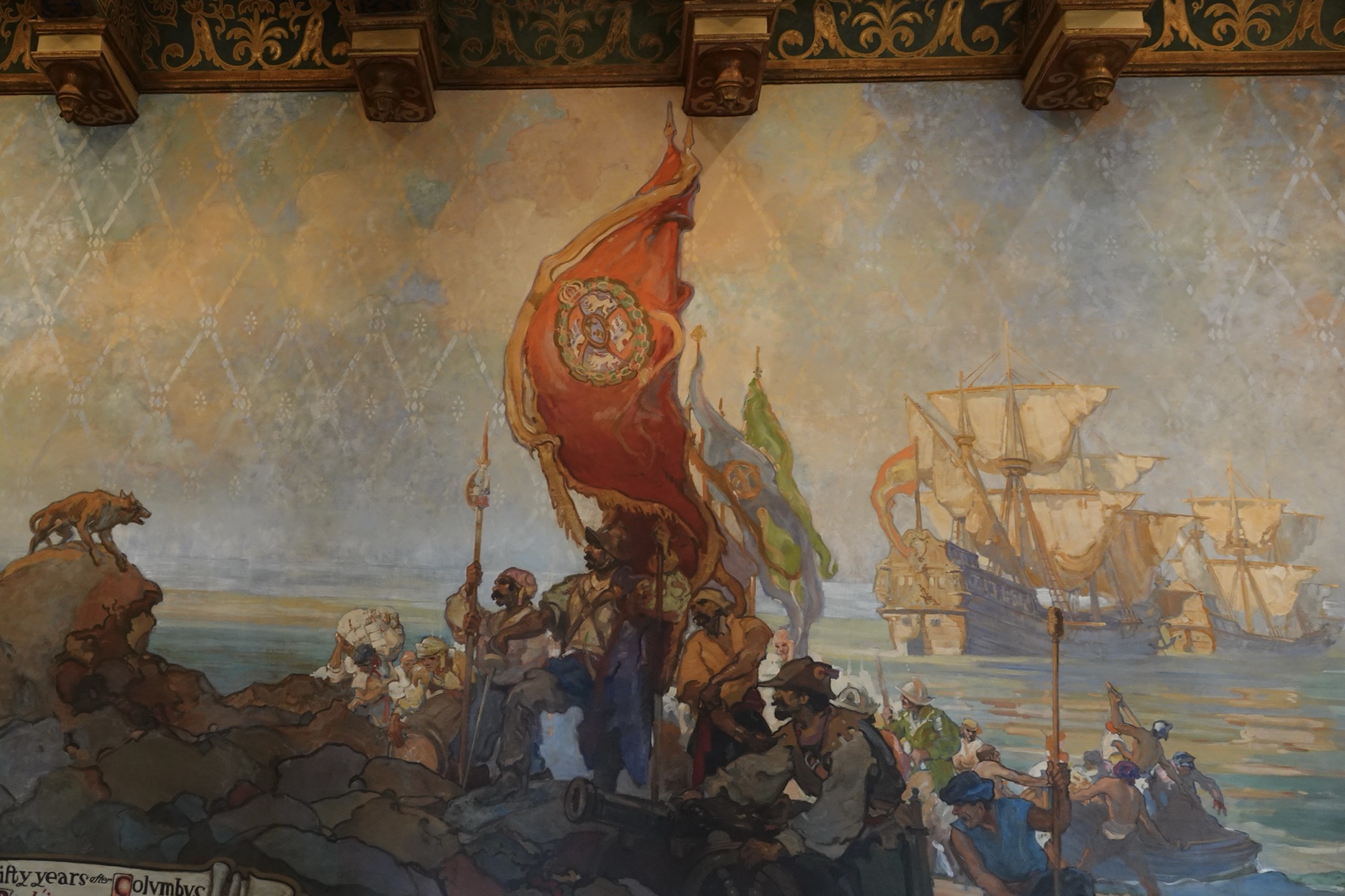 One of the fun things pointed out to us was that the Spanish ships supposedly at anchor all have their sails unfurled looking as if they are sailing away and abandoning the group planting the flag. That’s really just because a painting of a ship with sails furled is not as pretty.
