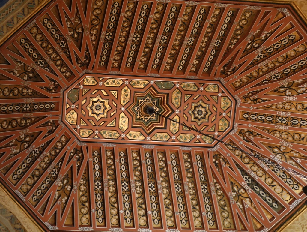 The ceiling above the main stairway is a replica of a 13th century Jewish synagogue ceiling. As is the case in Andalusia, Spain, where Islam, Christianity and Judaism all have a long history, this courthouse also has representations of all three religions.