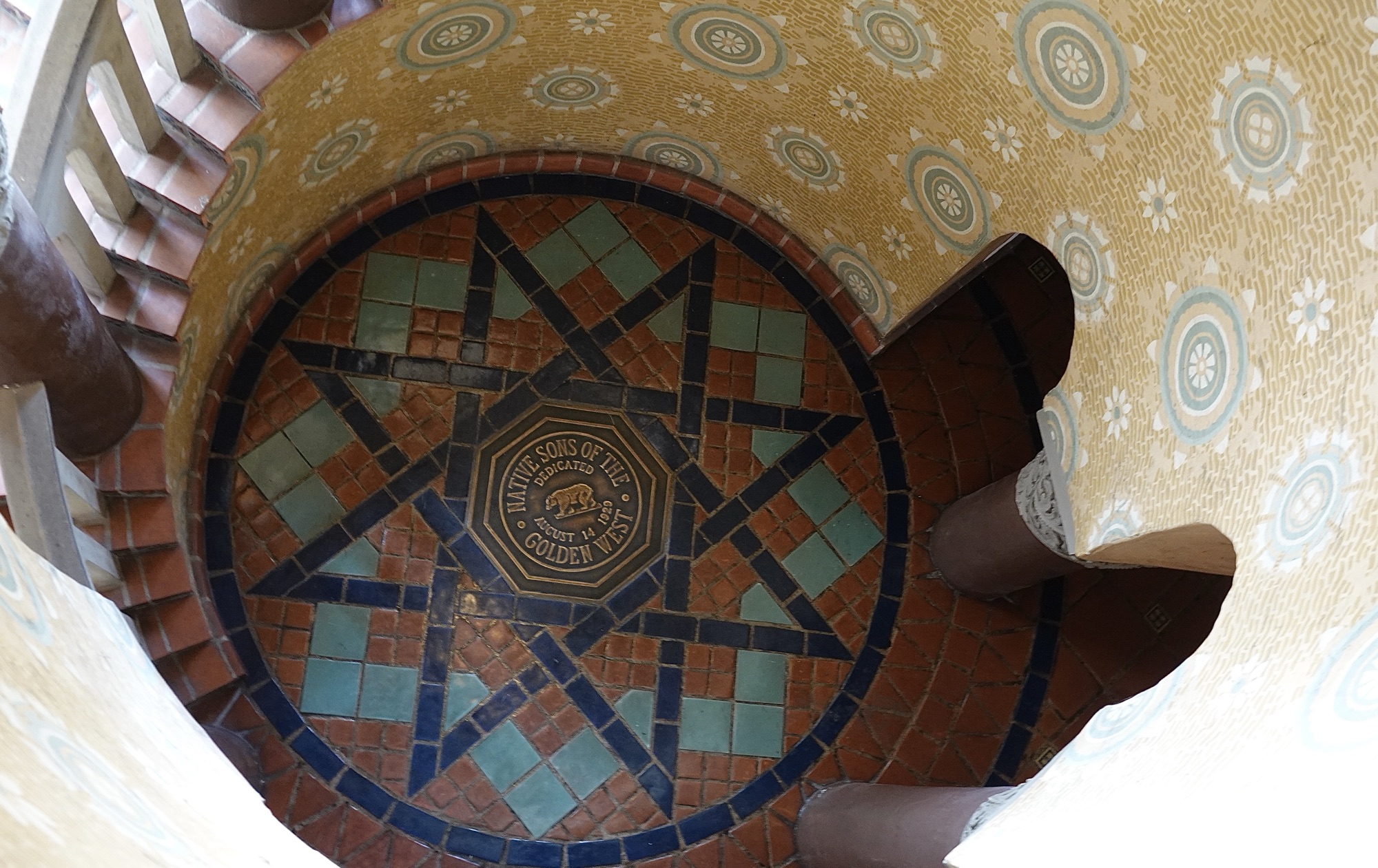 There’s a gorgeous mosaic tiled spiral staircase that leads to the castle keep. The only thing that is not typical is that the stairs themselves are evenly spaced. In an actual castle, they would all be different heights because the keep is for defence and defenders would know the pattern of the stairs, but attackers would not. Looking down the spiral, we could see the tiled floor design dedicated to the Native Sons of the Golden West.