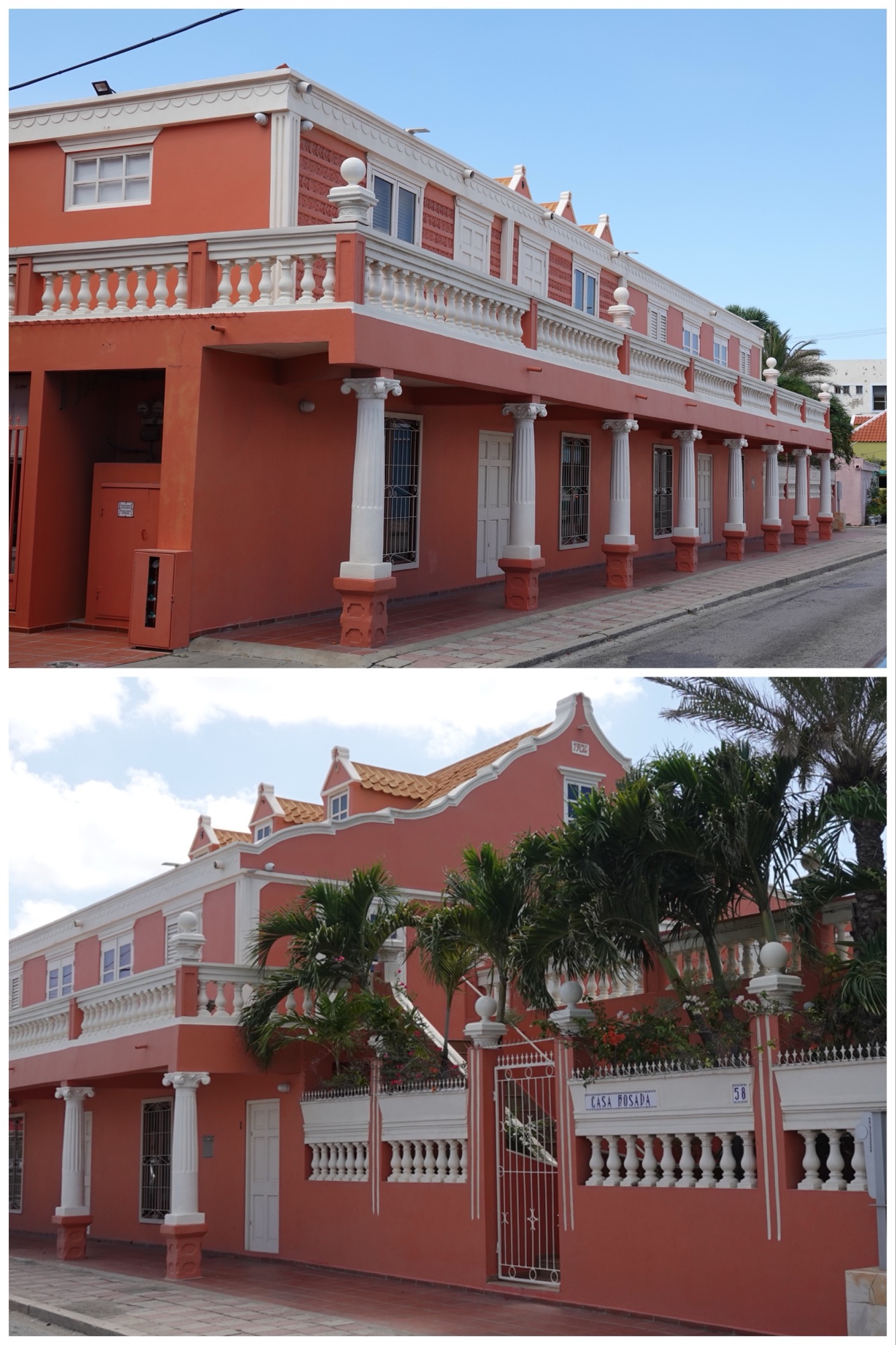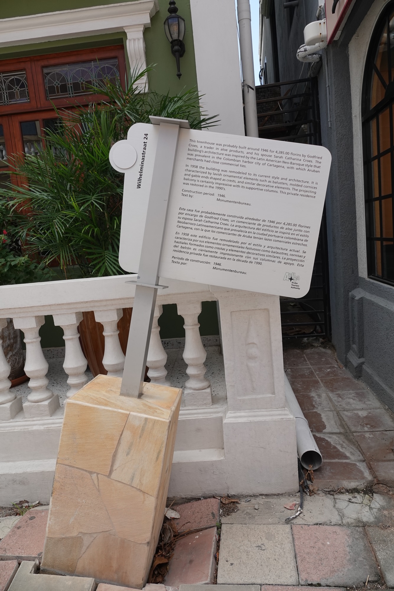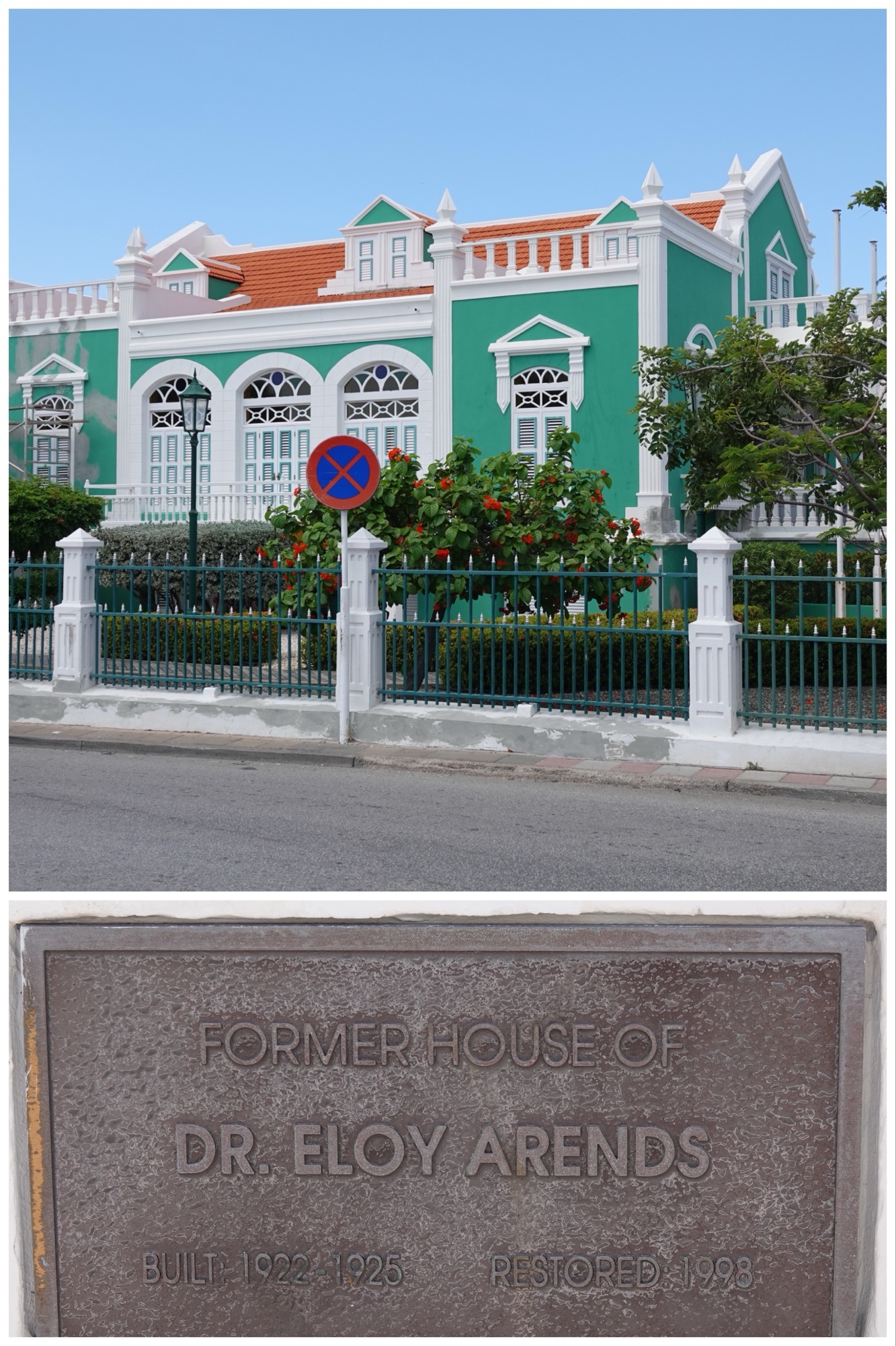 (From the historic marker) The building above, known to locals as the Eloy Arends’ House, is considered to be one of the most beautiful townhouses in Oranjestad. In all probability designed by Chibi Wever, Nicolas Picus and Dada Picus, the building was commissioned by Aruban physician Jacobo Eloy Arends, who worked as a general practitioner on the island before becoming a government physician in 1920. He also became the first Aruban to be appointed to the Advisory Council (Raad van Advies). Eloy had this stately home built in anticipation of his marriage to Maria Monica Laclé. In those days, it was customary for an engaged couple to hold off on marriage until the groom could offer his bride a fully furnished house. The future wife was not even allowed to be in the area, let alone see the house before it was ready. According to local superstitions, couples complying with these rules would enjoy a long and prosperous marriage.