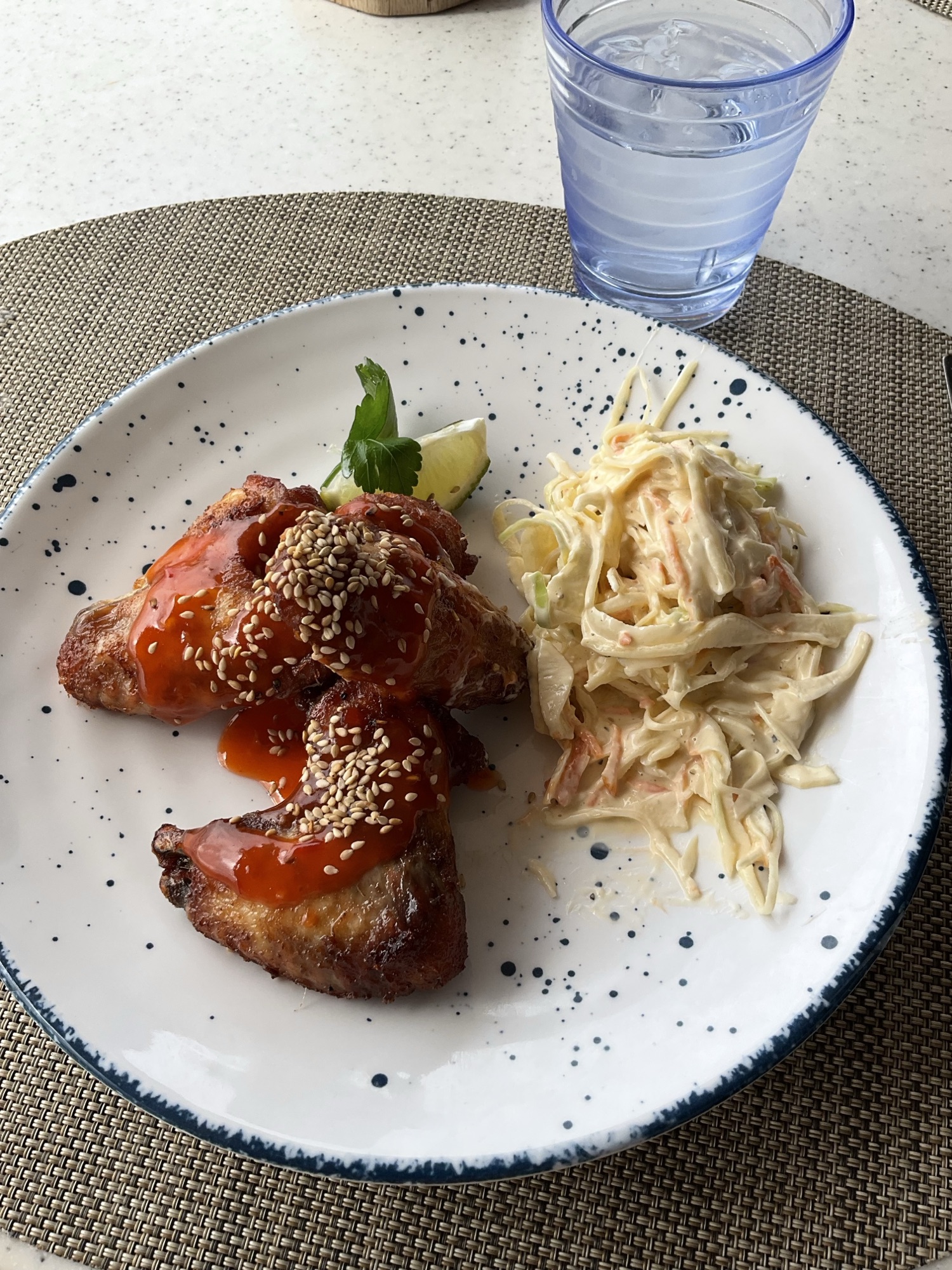 We returned ready for lunch, which we enjoyed in the warm breezes on the Aquavit Terrace. Asian sesame wings and coleslaw – and some icy cold water – hit the spot.