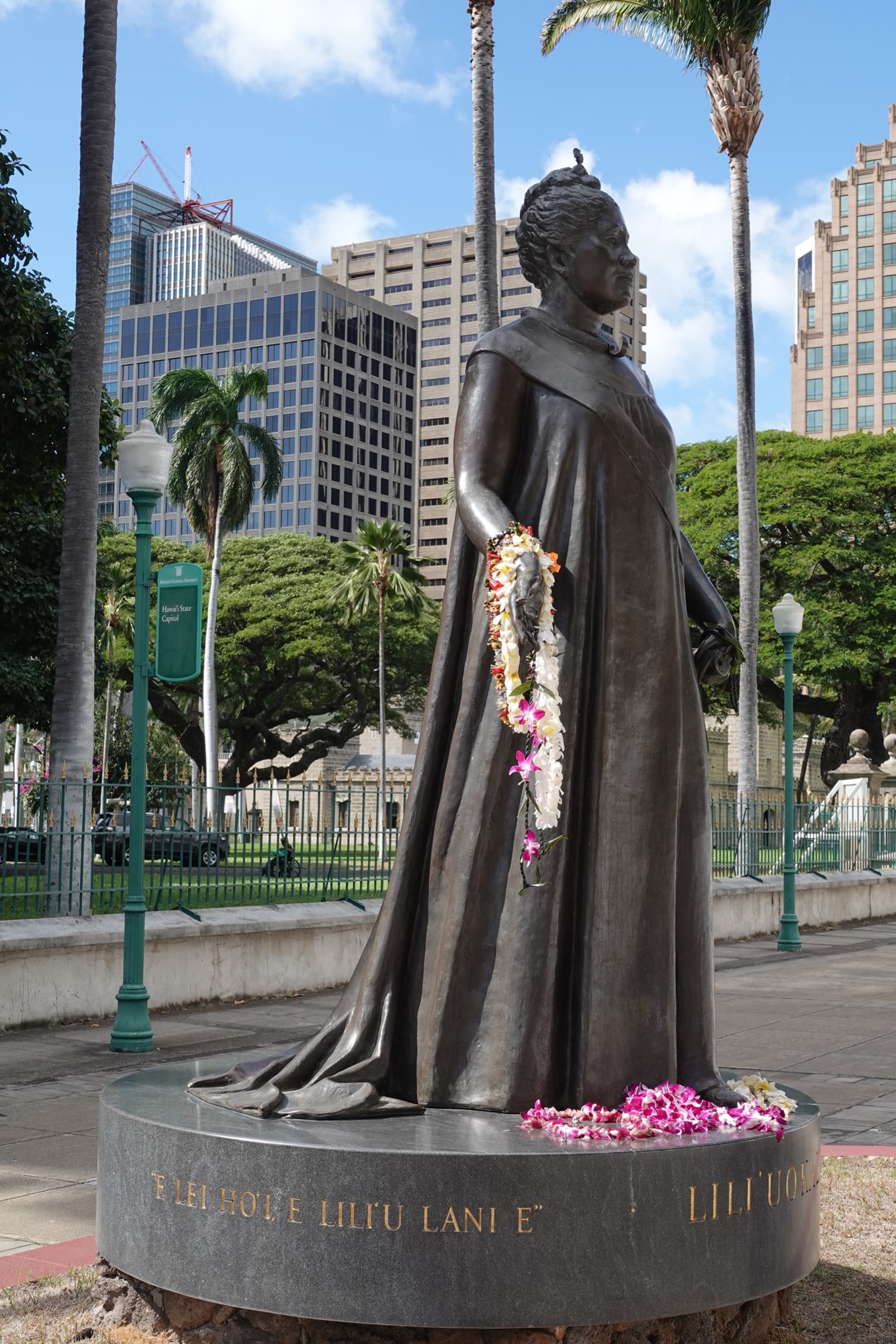 The statue of Queen Liliʻuokalani is located between Iolani Palace and the State Capitol building.