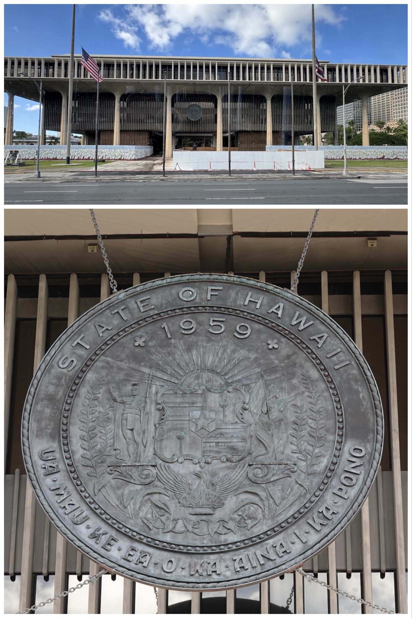 The Hawaiian State Capitol. The building, representing the islands, used to be surrounded by water; that “moat/ocean” is currently being replaced by reflective tile.