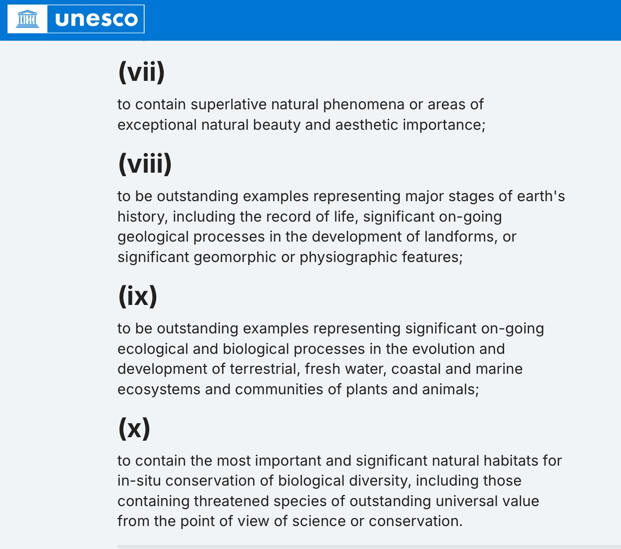 UNESCO does not go out looking for sites. The World Heritage List requires a country to identify sites – cultural or natural – in danger of degradation or destruction. A location then becomes a world heritage site if after a favourable review by UNESCO its value is verified, using 10 criteria, 6 cultural and 4 natural.