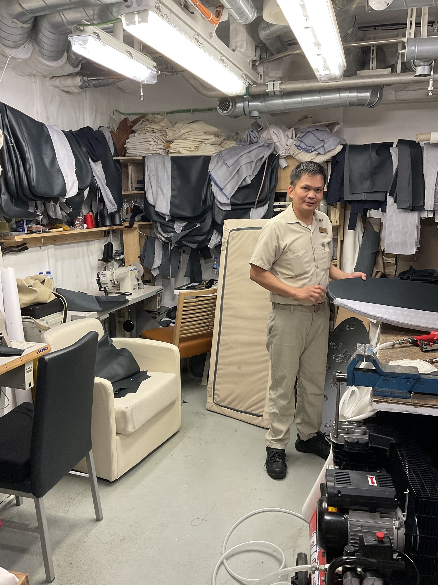 After nightfall, we headed to the top deck to look at the stars being revealed as clouds moved away. While we were there we discovered a late-night worker in the upholstery workshop, where repairs to all of the soft furnishings on the ship are made. Since we’d come upon it inadvertently, I asked permission before taking this photo.