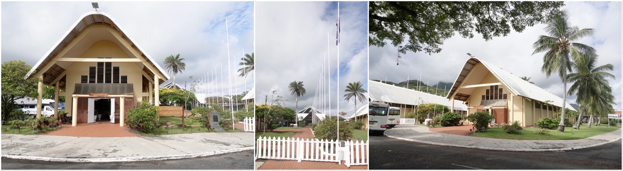 At the tiny National Museum (no interior photos allowed) we saw examples of clothing made from hibiscus wood, and cantilevered (single hull catamarans) canoes of the type used by the original Polynesian settlers to the Cook Islands. The museum was located on the same site as the mirror-image National Library, with the Department of Corrections buildings in between.