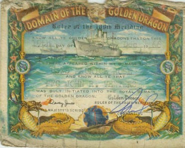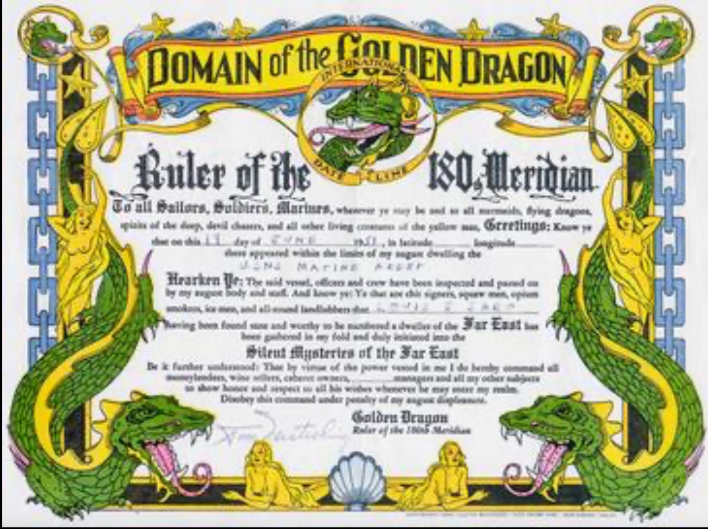 According to Wikipedia, “The Domain of the Golden Dragon, Realm of the Golden Dragon, Imperial Order of the Golden Dragon, or Sacred Order of the Golden Dragon, is an unofficial award given to crew members of ships which cross the International Date Line.