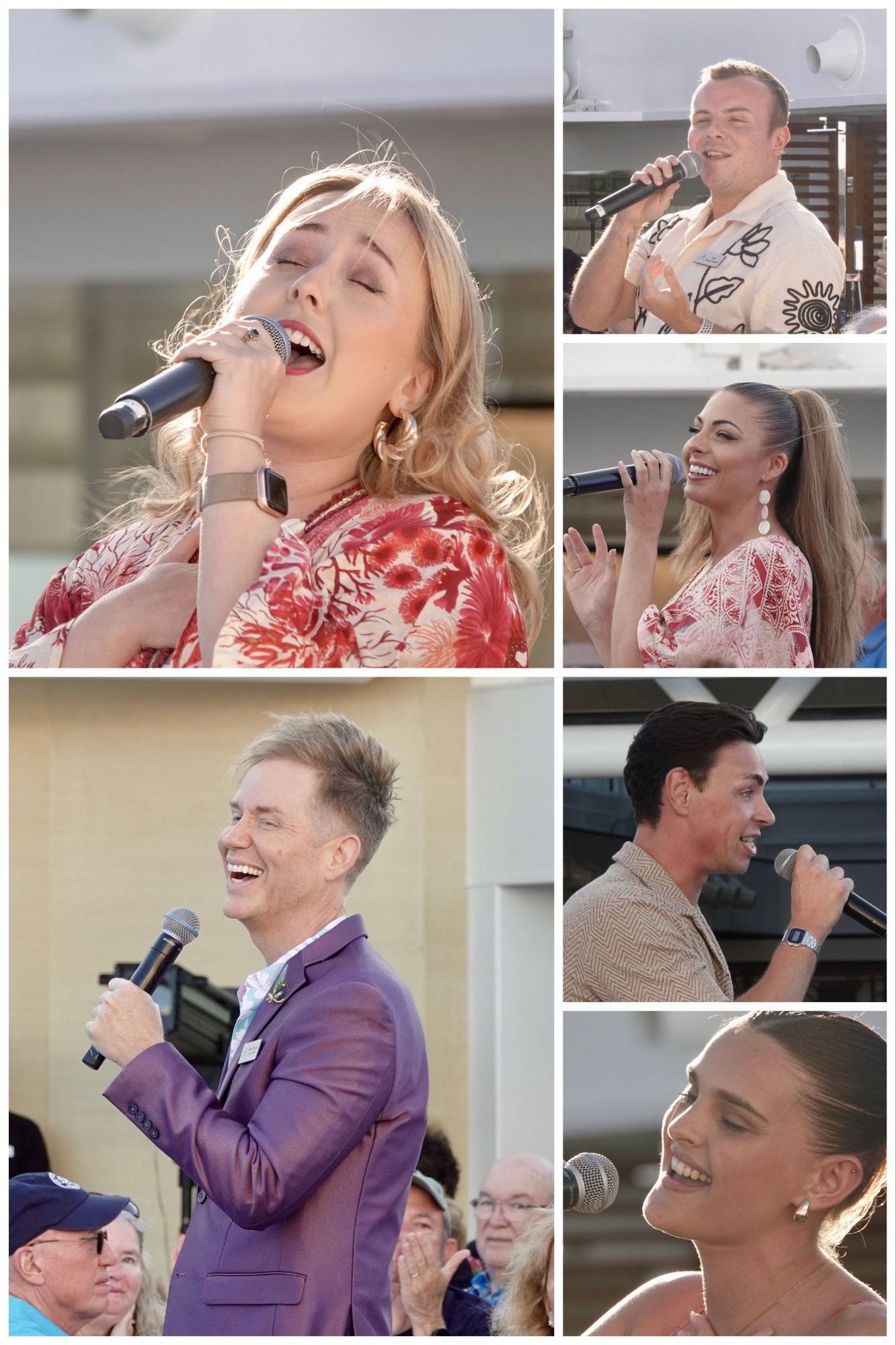 Left: Assistant Cruise Director Tara and Cruise Director Matt. Right top to bottom: Viking Vocalists Kyle, Lucy, Barry, and Ellis.