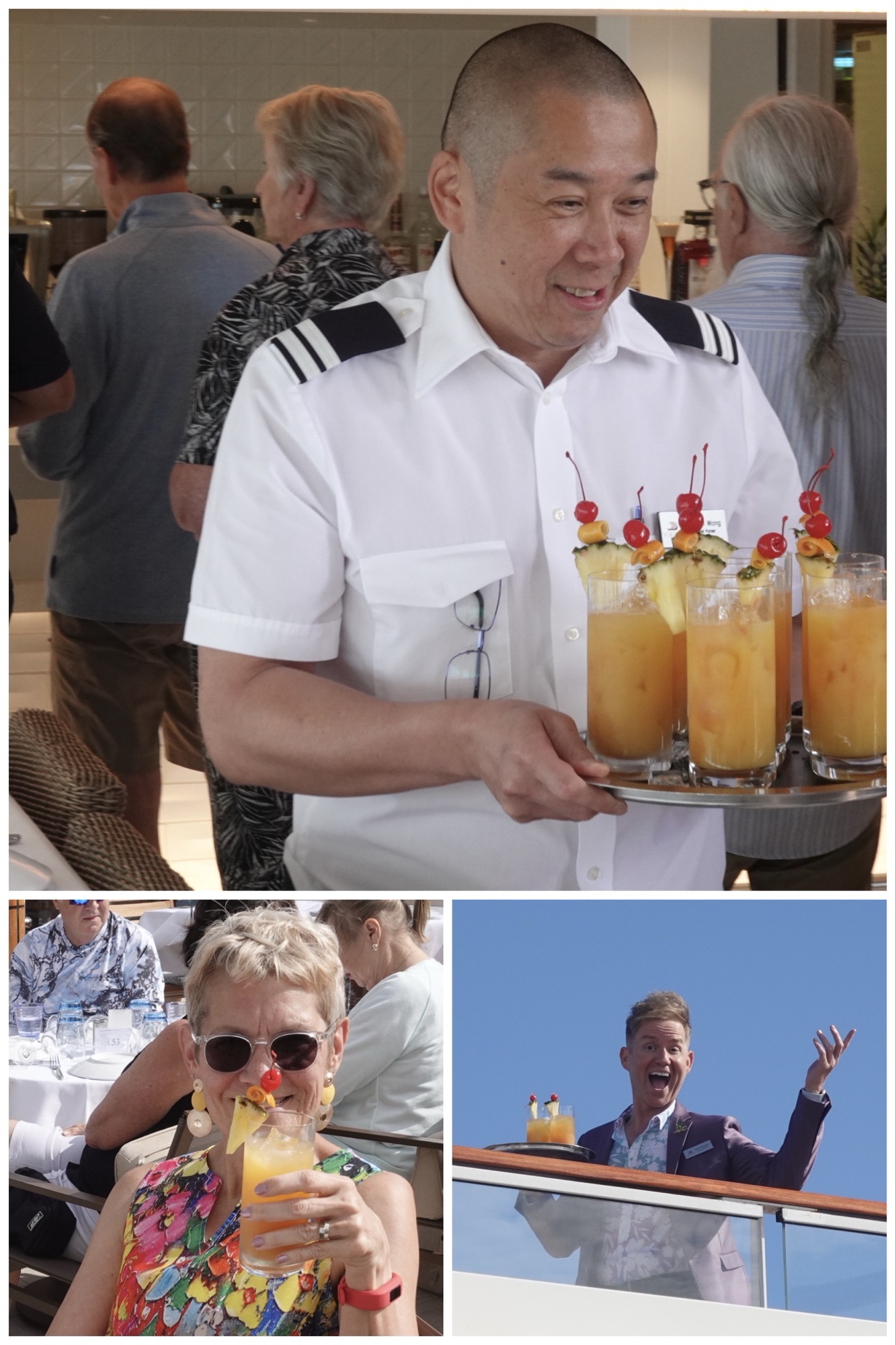 Hotel Purser Adrian (top) and Cruise Director Matt (bottom) with trays of the evening’s special cocktail, dubbed a “New Zealand Sunrise/Sunset” : orange juice, vodka, galliano, aperol, and amaretto, garnished with fresh pineapple, orange, and cherry.