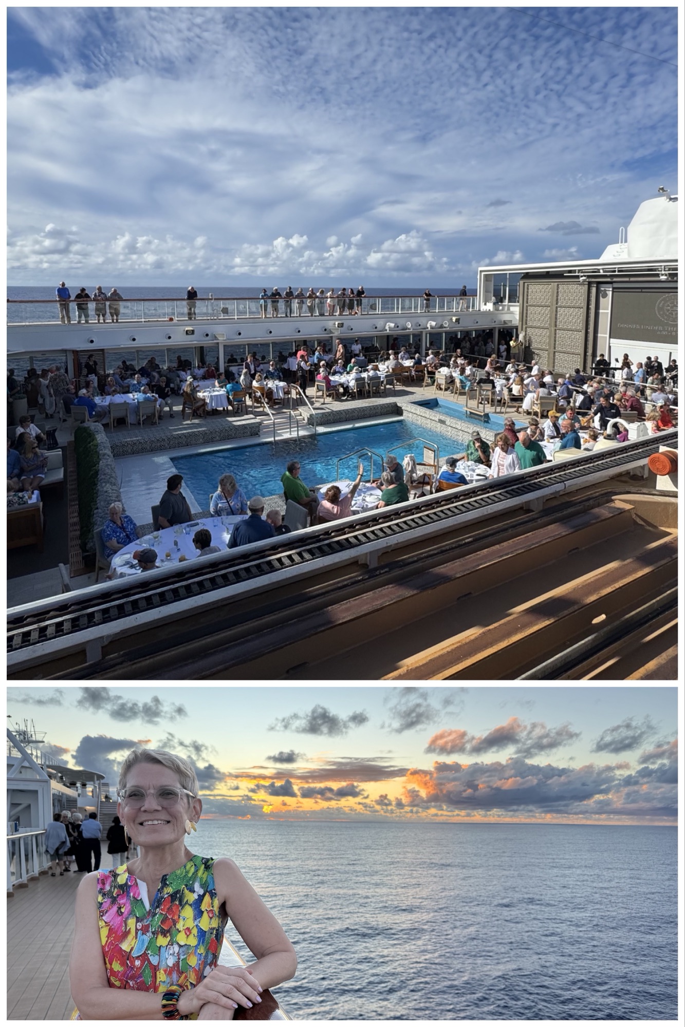 It was another day of lovely calm seas, sunshine, soft sea breezes, and just chatting, reading, and relaxing until the evening’s special event celebrating our crossing of the International Date Line.