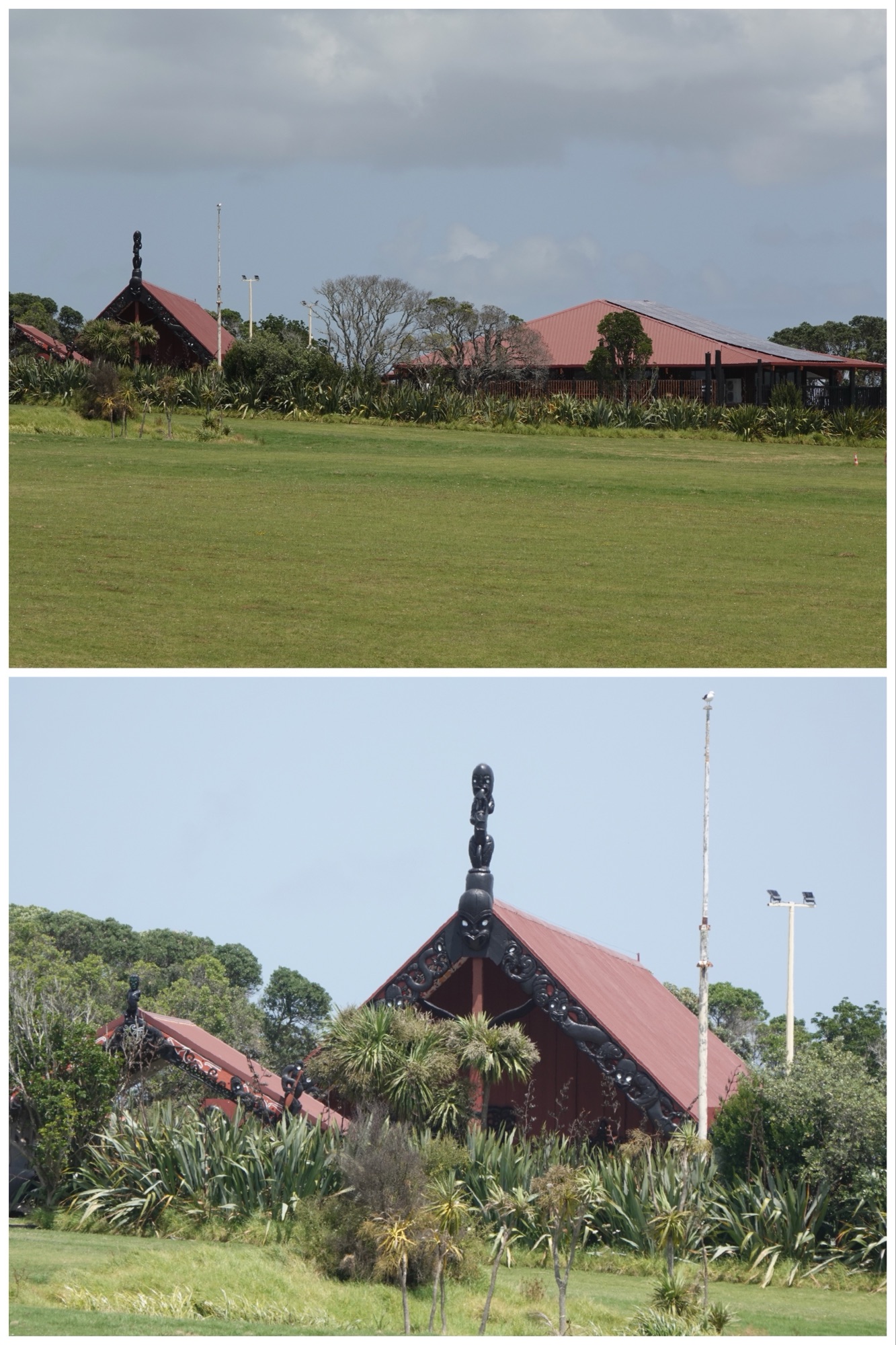 Above the park was a Māori village with its marae visible from the park grounds. It was private land, so we could not enter, but Ted was able to,zoom in on the marae.