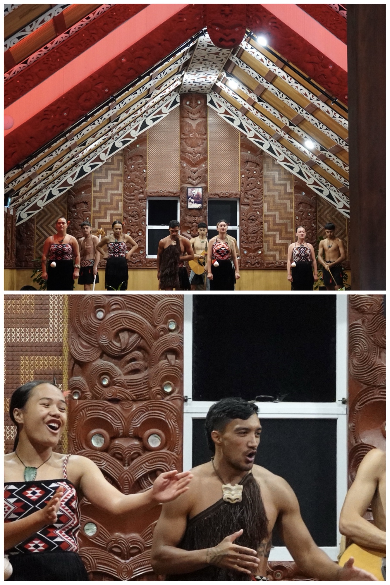 Once cleared to enter the village, we were invited into the marae’s wharenui (meeting house) for a cultural demonstration that included a pōwhiri, or sacred welcome ritual, plus dance, song, and a haka (warrior chant/challenge). While the decoration in this wharenui was nowhere near as ornate as in the hotunui displayed in the Auckland Museum, it was still very beautiful.