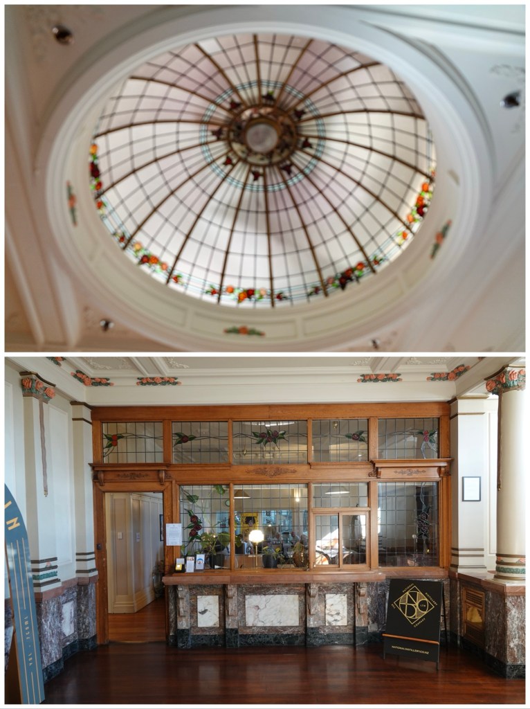 When it came time to rebuild the factory in 1933, architect Louis Hay, responsible for rebuilding much of Napier, proposed a wonderful Art Deco style building, but Art Deco was “too plain” for Gerhard. The result was an Art Deco building in geometric form but decorated in the more colourful and flamboyant Art Nouveau style, with an interior featuring Italian marble, English oak, and plaster decorations depicting oranges, apples, grapes, and roses. The wooden entry doors carved by Walter Isaac Marquand cost £600 in 1933, equivalent to 1 million today.