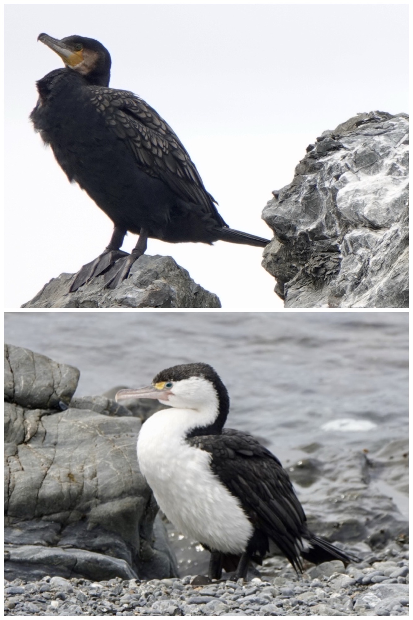 Top: Bronze Shag. Bottom: Pied Shag. Both are related to cormorants .