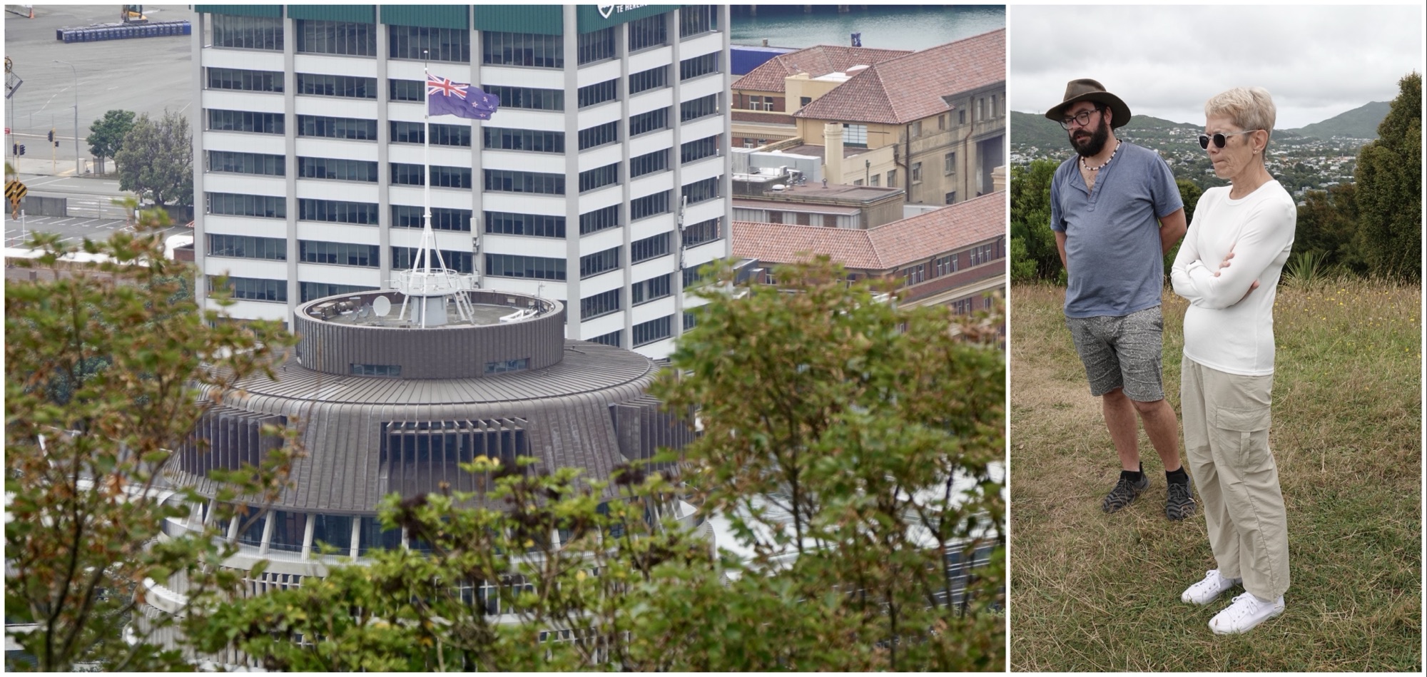 Waiwai and I apparently contemplating the New Zealand flag atop the Beehive, as seen from the hilltop.
