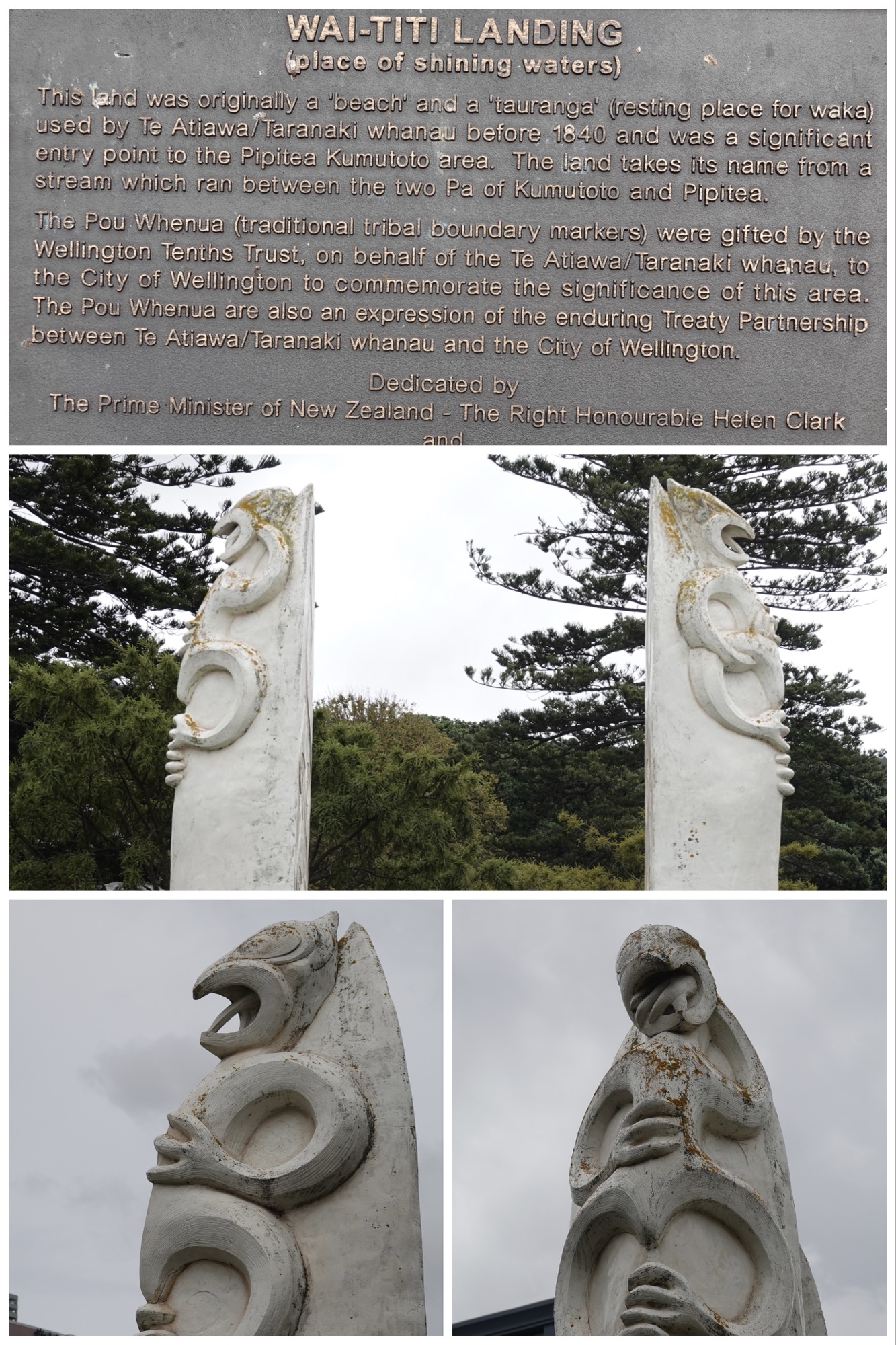 Left top & bottom: Māori totems on the entrance to the Beehive. Right: one of two huge totems in front of Parliament House.