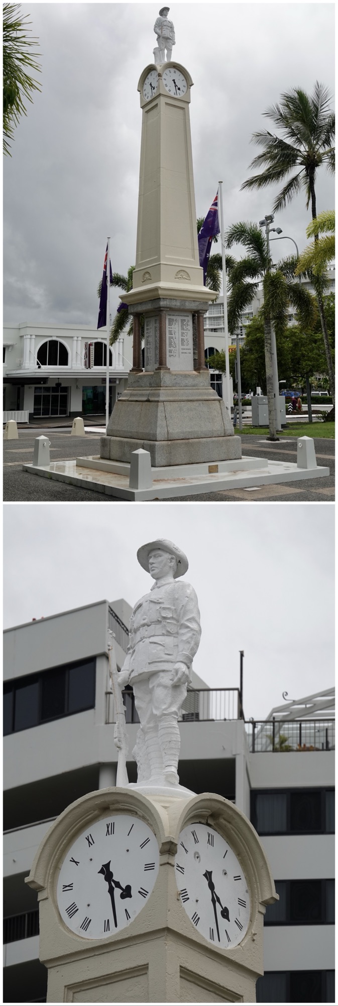 The Cairns cenotaph is located on the esplanade, where walkers and bicyclists pass it every day. When it was built in 1925 it had a working clock on 4 sides, but now the clock faces are permanently painted to read 4:28 p.m., which is the time at which the ANZAC landing at Gallipoli commenced on the morning of 25 April 1915.