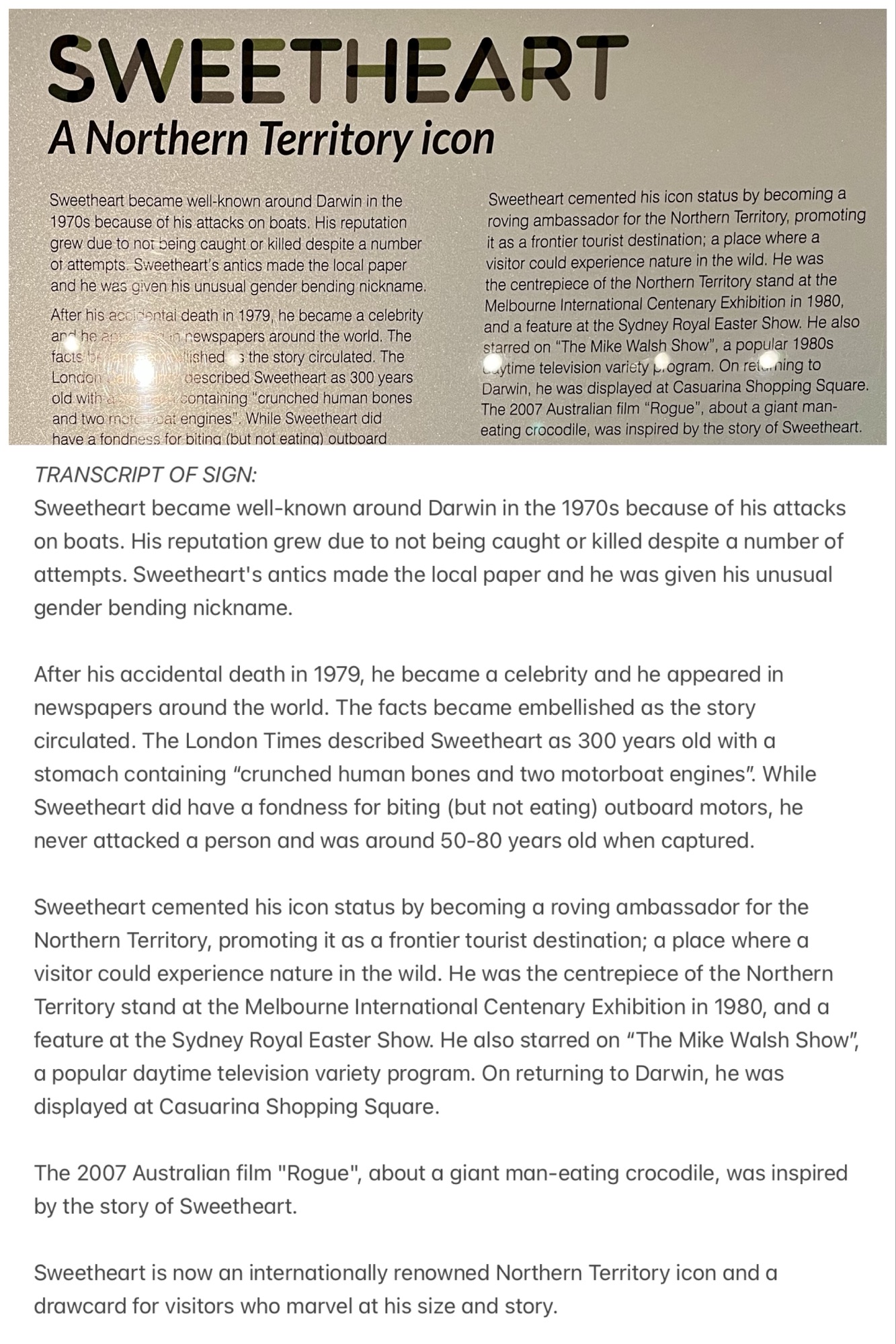 Given that we were going crocodile watching in the afternoon, one of the displays in the museum that grabbed our attention was “Sweetheart”. The crocodile was a legitimate icon in Darwin, but after his death turned into a much-exaggerated urban legend.