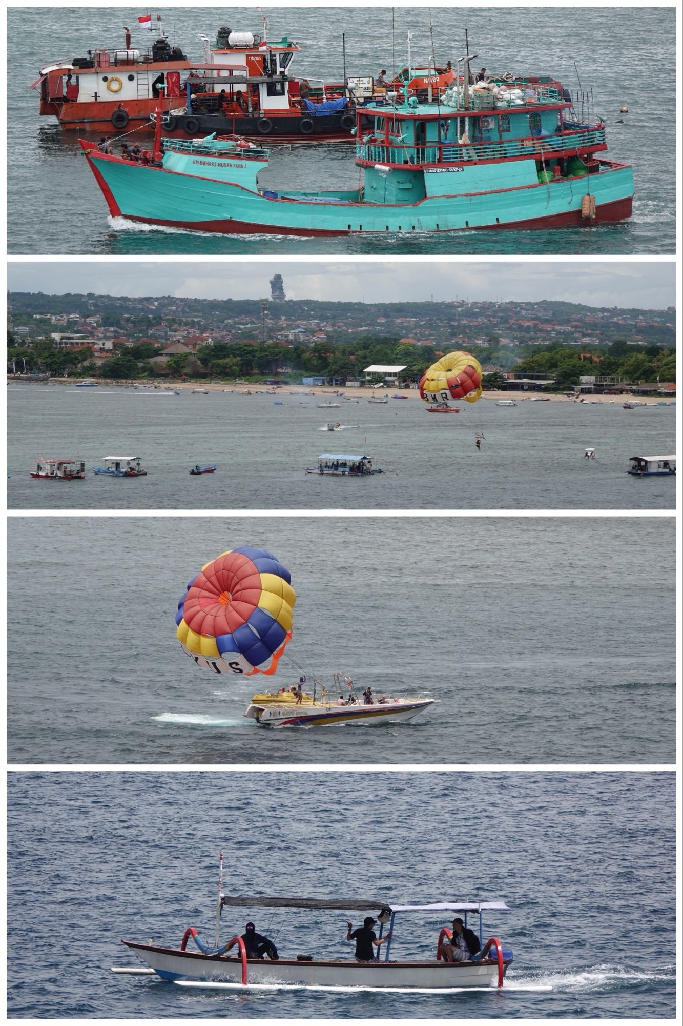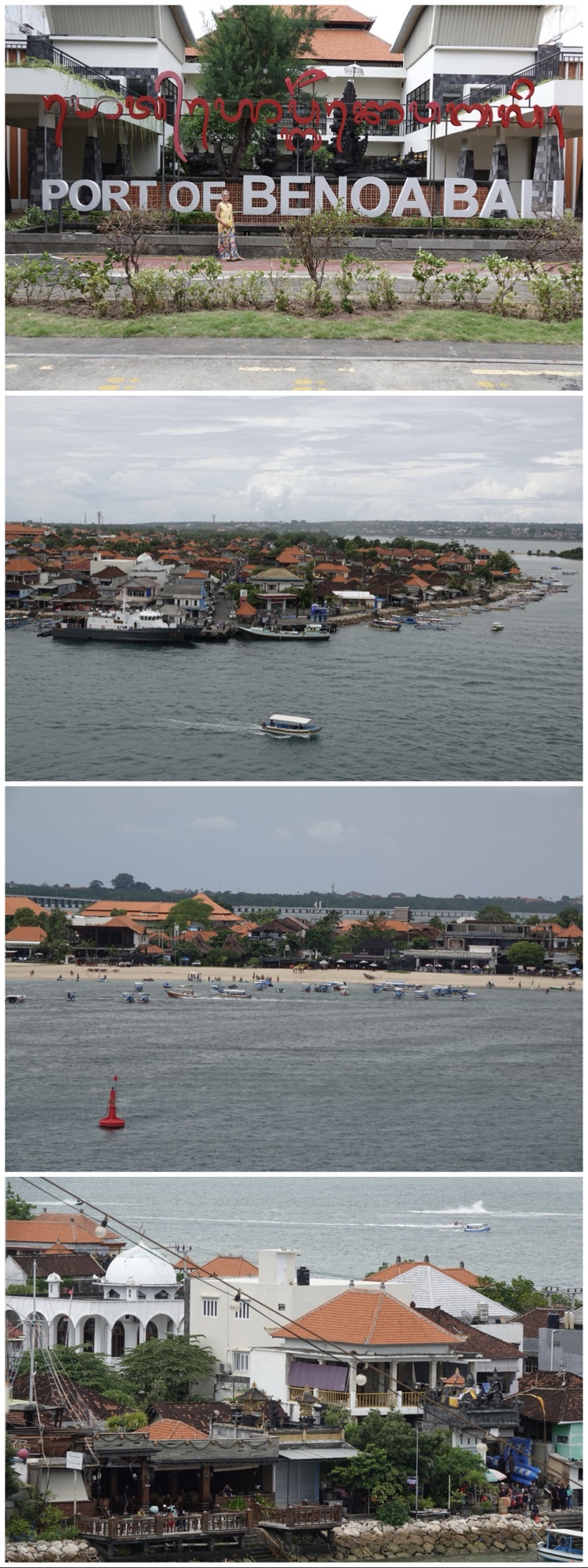 Then, suddenly, we could see Bali. Entering the port at Benoa was spectacular: a huge green lagoon to one side; planes headed to the airport soaring above us; a bay filled with sampans, parasailers, and jet-skis; waterfront buildings boasting deep orange tile roofs…