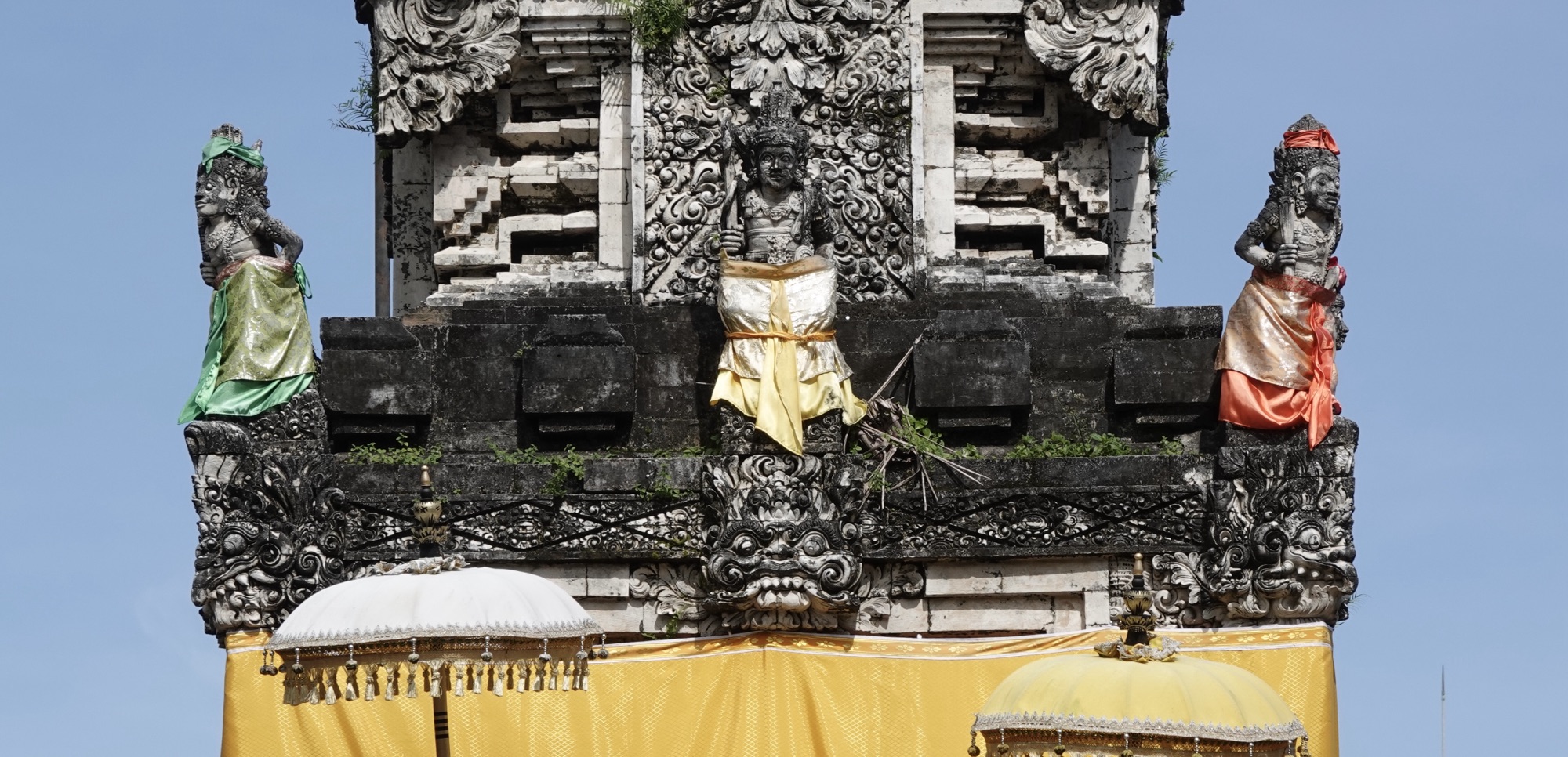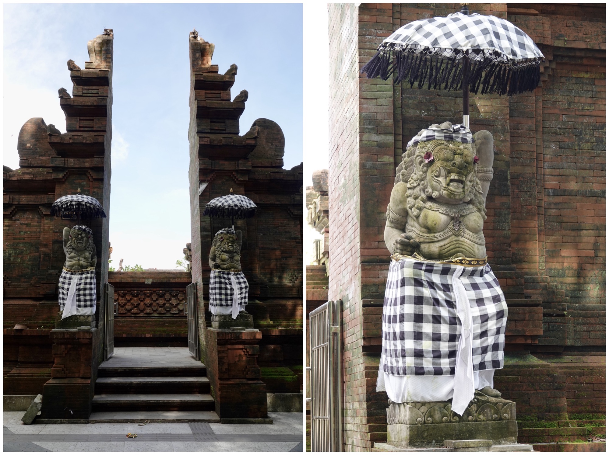 Our guide Dayu took the time to explain the symbolism of the textiles used in the temples. The black and white checked cloth wrapped around the statues represents a balance of good and evil. The plain yellow signifies a god, the plain white a goddess, and the combination of yellow and white show a balance between make and female deities.