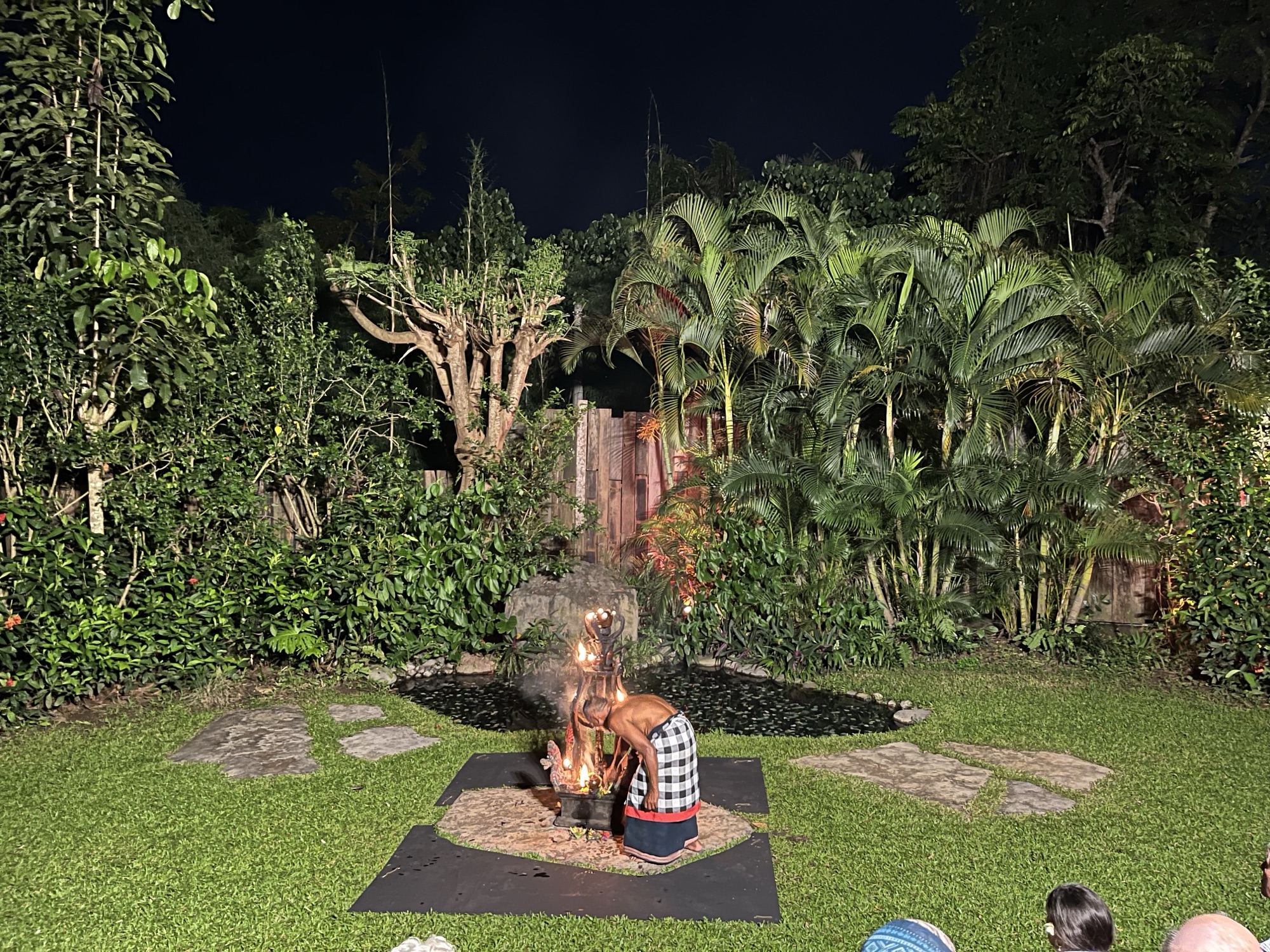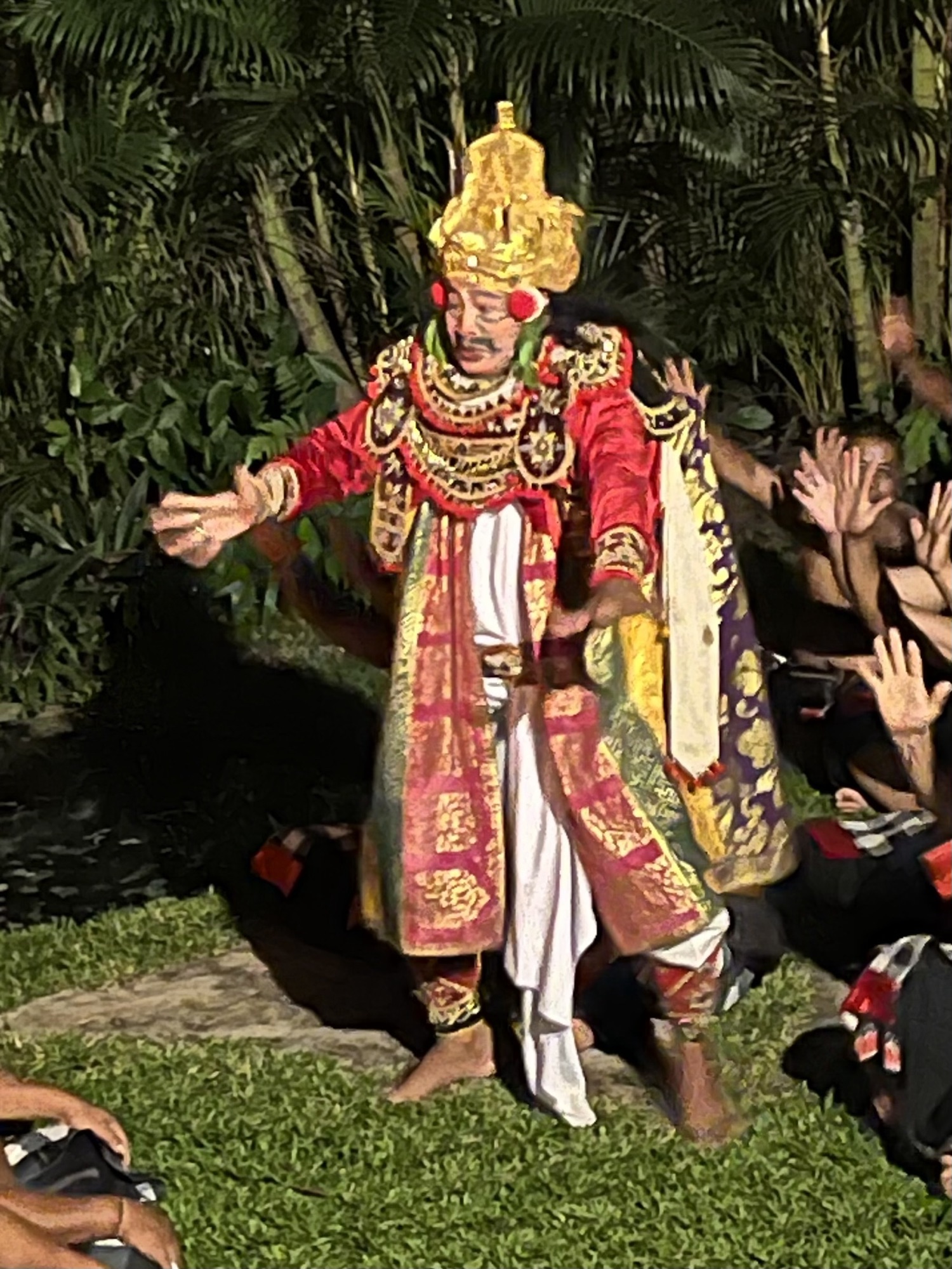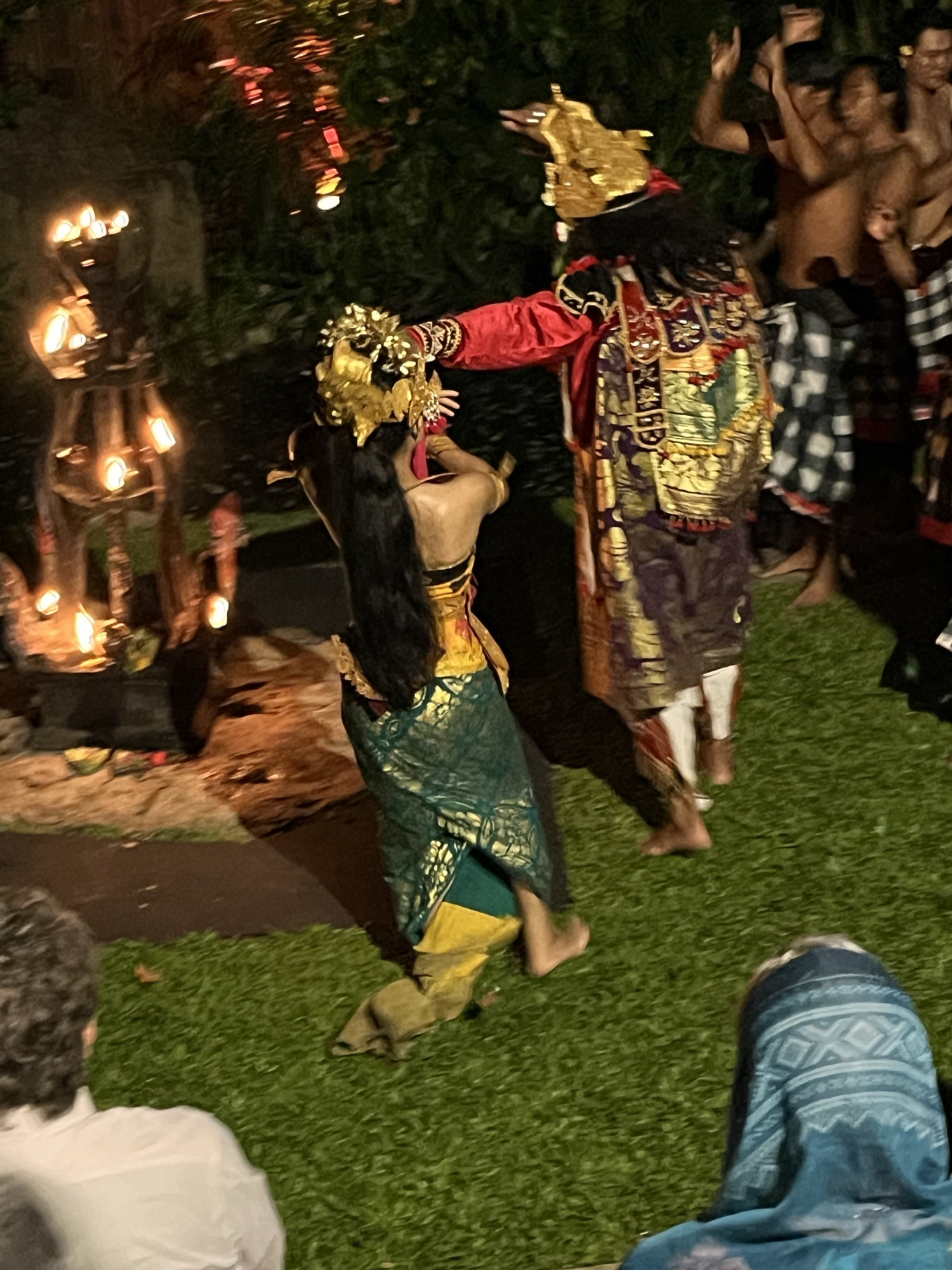 The Kecak is a ritual dance that recounts an epic tale from the Hindu Ramayana. On a stage lit only by glowing torches, around 60 men chant and sway in a trance-like rhythm while colorfully costumed dancers weave their way among them to tell their story. Our guide likened the chanting to beat-boxing, since it is the only “music” accompanying the dance. She also shared that it was the inspiration for parts of the soundtrack for the 2010 movie The Last Airbender.