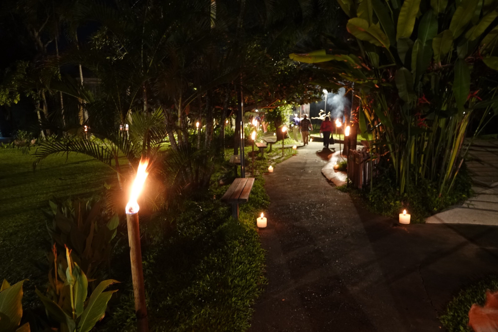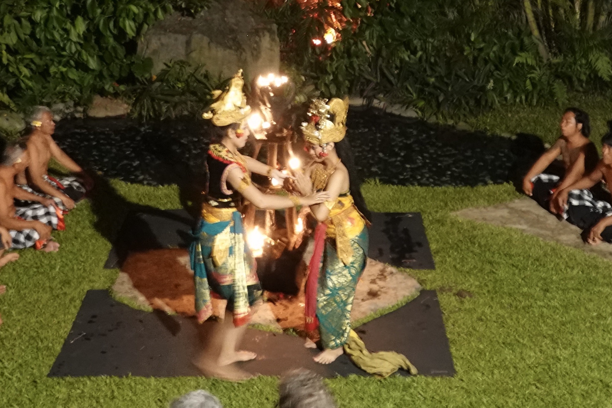 After a truly delicious dinner, in a lovely open-air restaurant with servers in traditional Balinese dress, we walked down a torch-lit path through lush vegetation to the outdoor theatre where we would be watching the Kecak. The venue thought of everything; en route, we were offered mosquito repellant!
