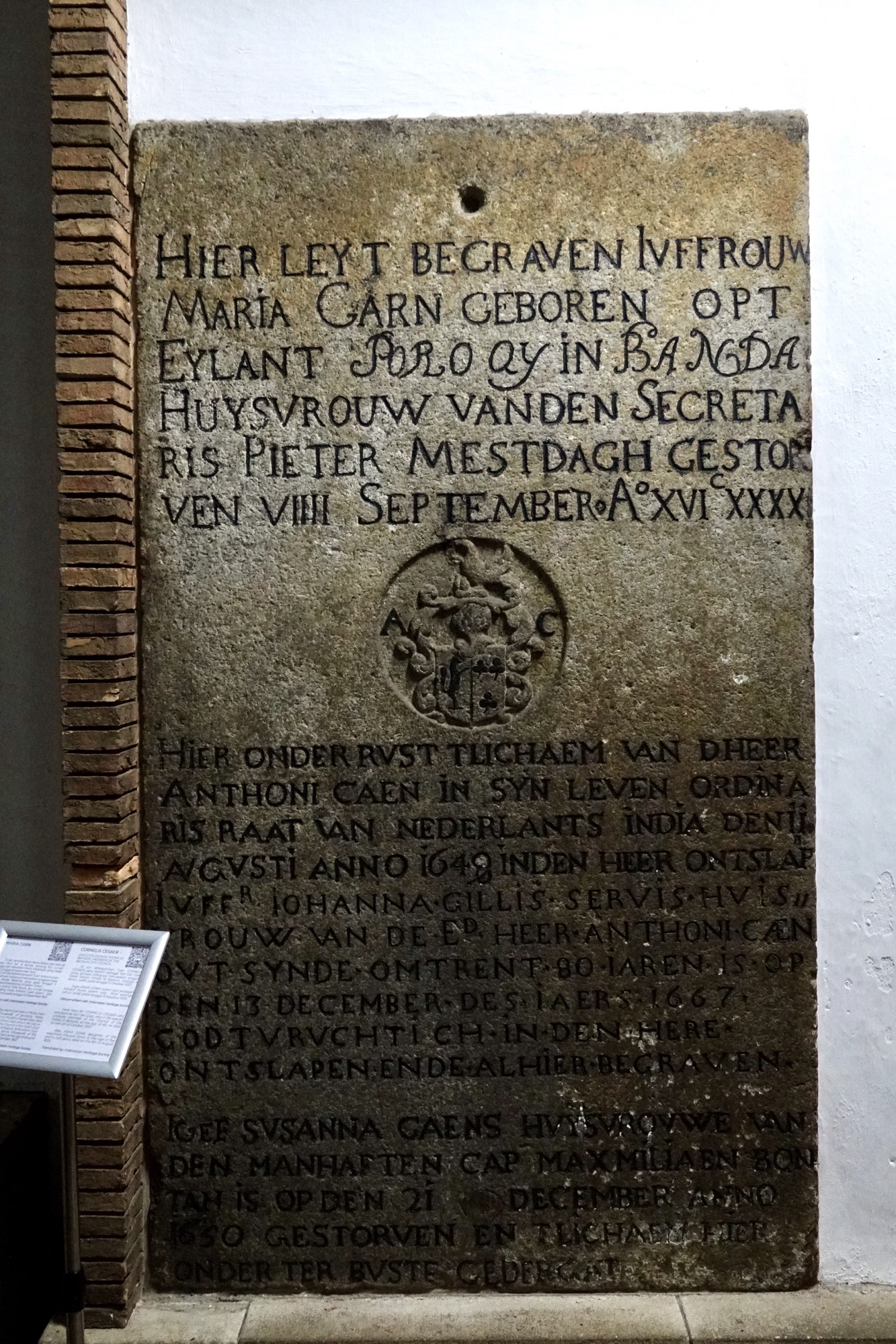 Here rests Mr. Anthoni Caen who in life was an ordinary member of the Council of the Dutch East Indies, who on the 2nd of August, 1648 rests in God.