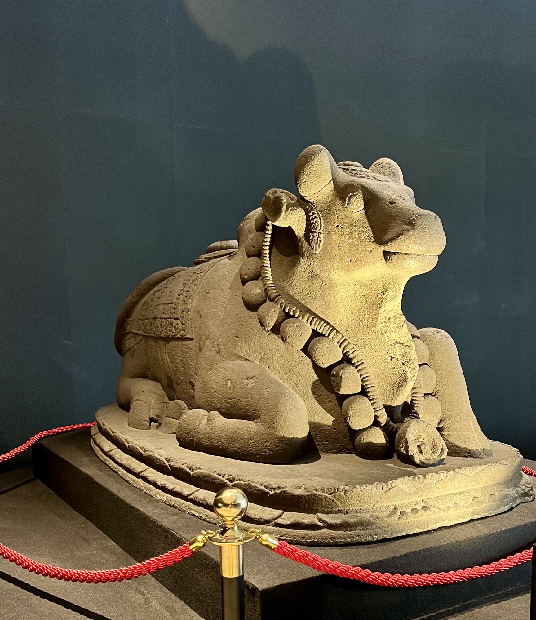 The Nandi statue from the Singhasari period is depicted wearing extravagant jewelry. Nandi is the mount of Lord Shiva, as well as the guardian of Shiva’s abode. In Sanskrit, nandi means happiness or contentment.