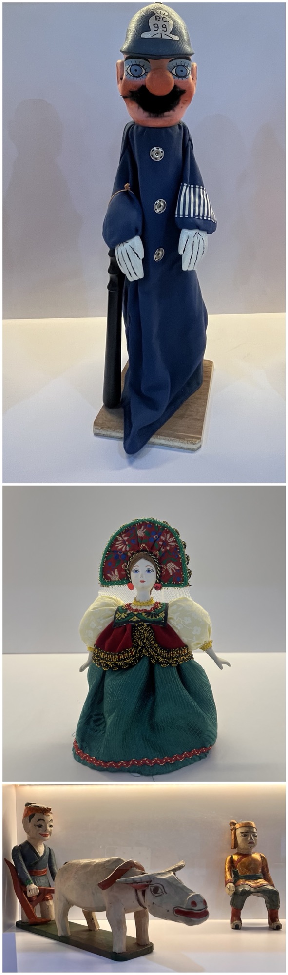 Top: from the U.K, the policeman from a Punch & Judy show. Centre: a Russian puppet.Bottom: a Vietnamese puppet set.