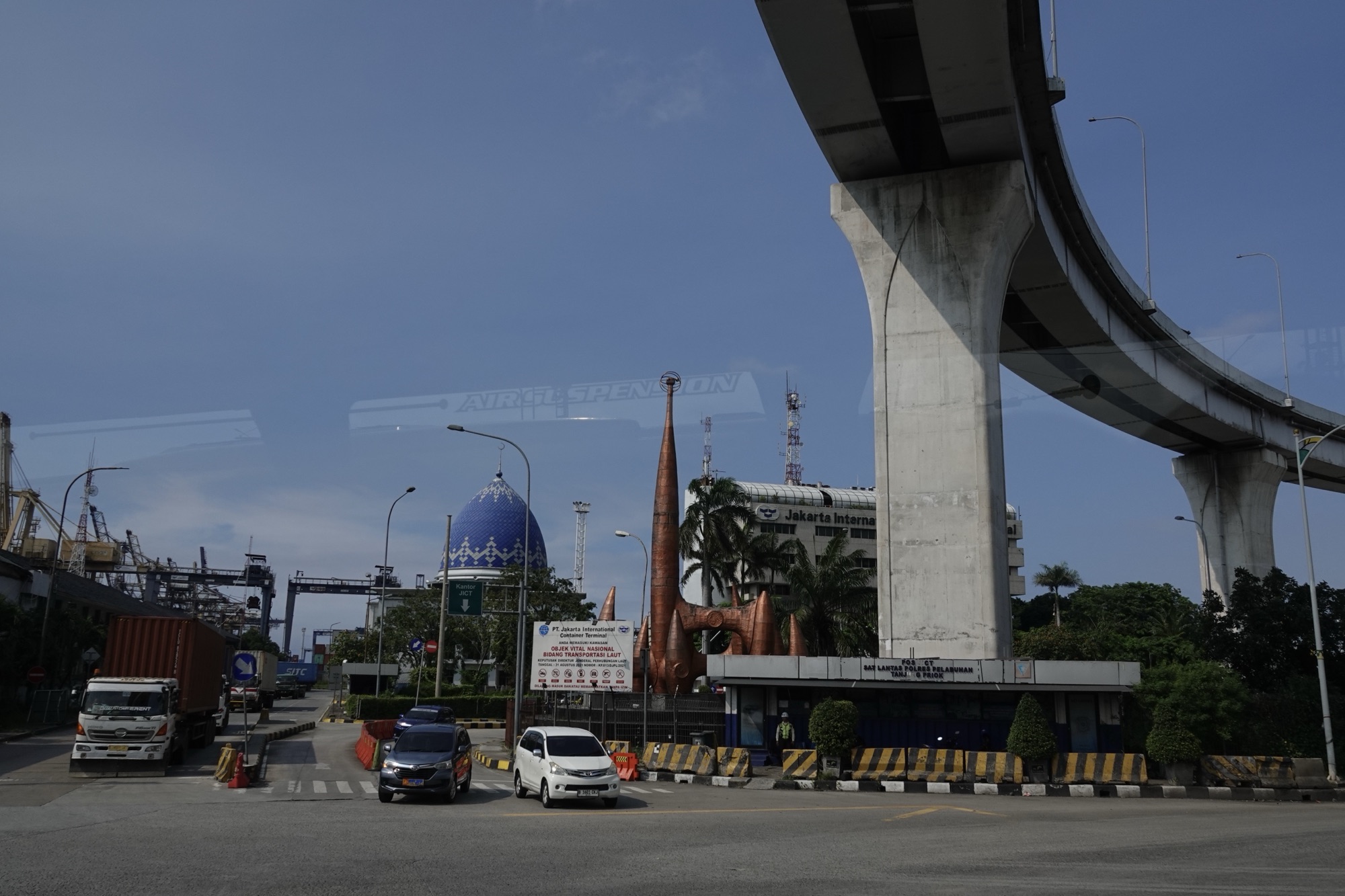 Exiting the port area under the new LRT line, which when completed will extend all the way to Bogor, about 70 km south, and from where many peope commute to work in Jakarta.