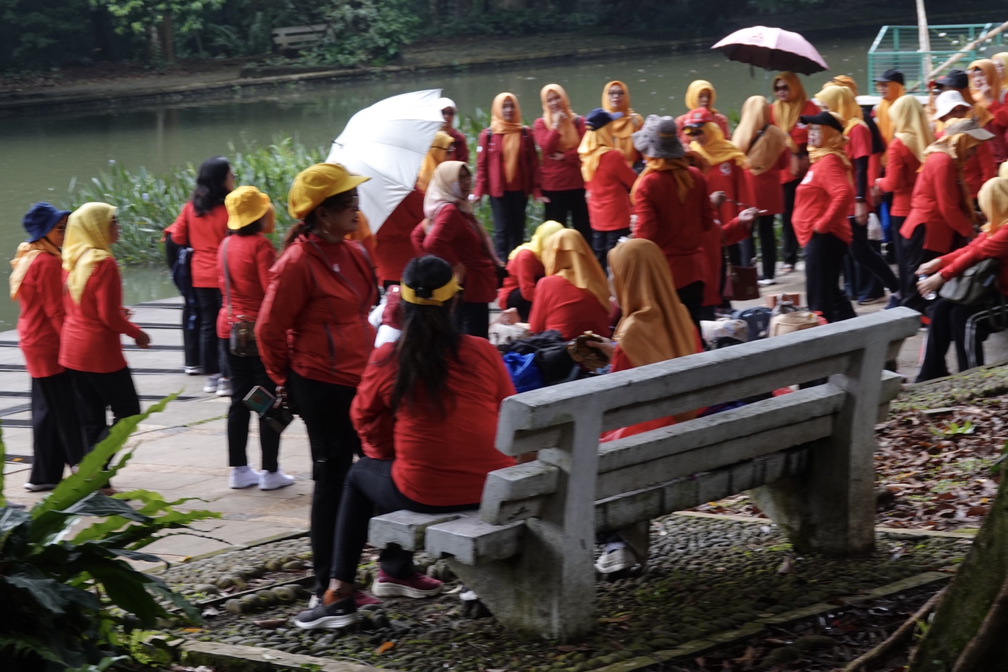 Outside the orchid house, we’d seen a yoga class being held. We were told that there are many women’s associations in Java, to both socialize and exercise. Java is mostly Islamic, so men and women do not socialize in mixed groups without their spouses. Since Ramadan is in a couple of days, many of the groups were also gathering for celebratory al fresco meals before their period of fasting. We observed several in the park.
