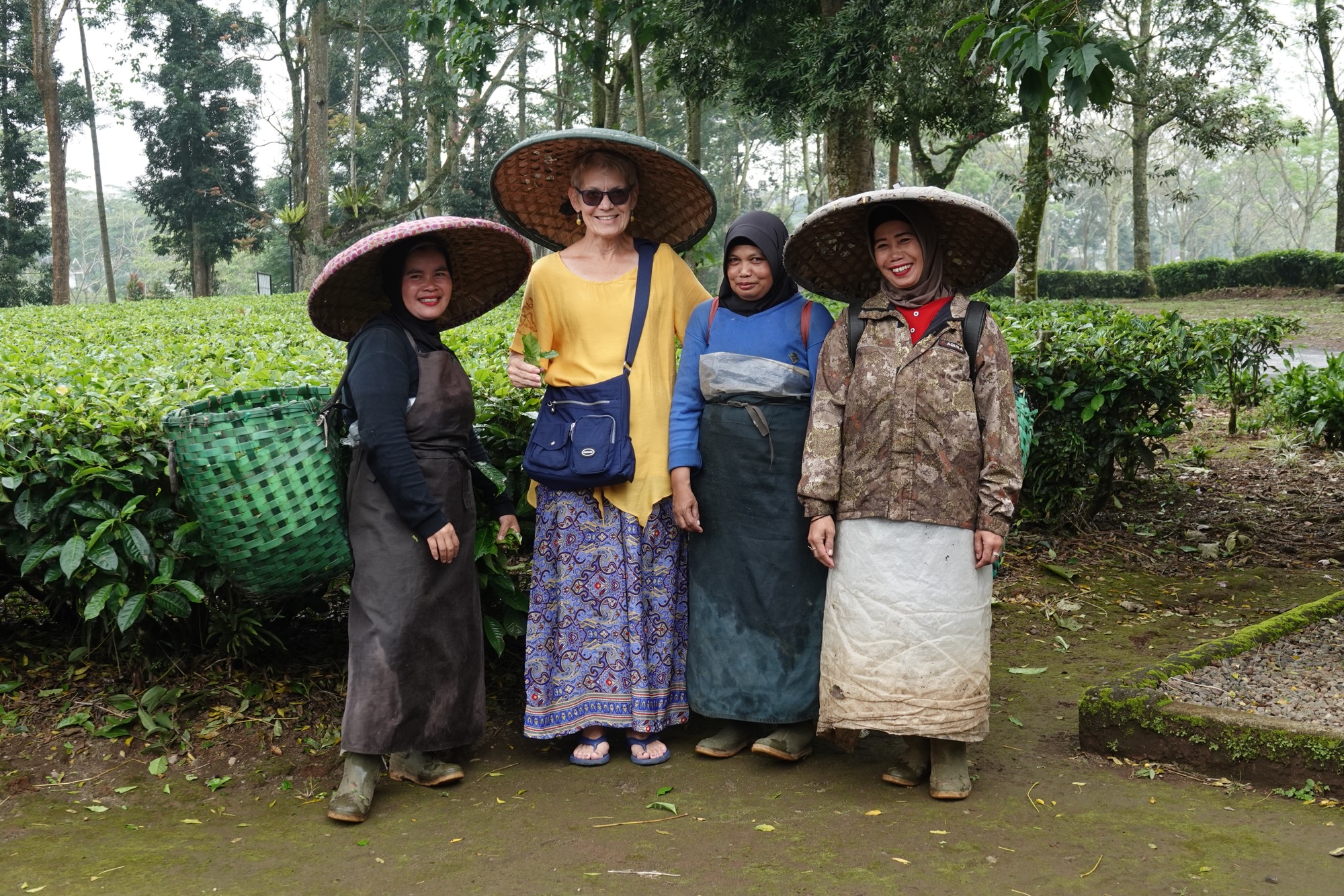 Pickers get paid according to the weight of leaves that they pick. An experienced picker can pick 30 kg in a day, for a payday of 100,000 to 150,000 rupiah. It is not considered a job in itself, but a supplement to the family income, where the father often works in the tea processing facility. That probably explains the big smiles and giggles elicited by the 100,000 rupiah (less than $9 CAD) I gave the ladies to share for allowing me to take a photo with them, in which one of them insisted that I wear their hat. I was determined to leave all my rupiah in Indonesia.