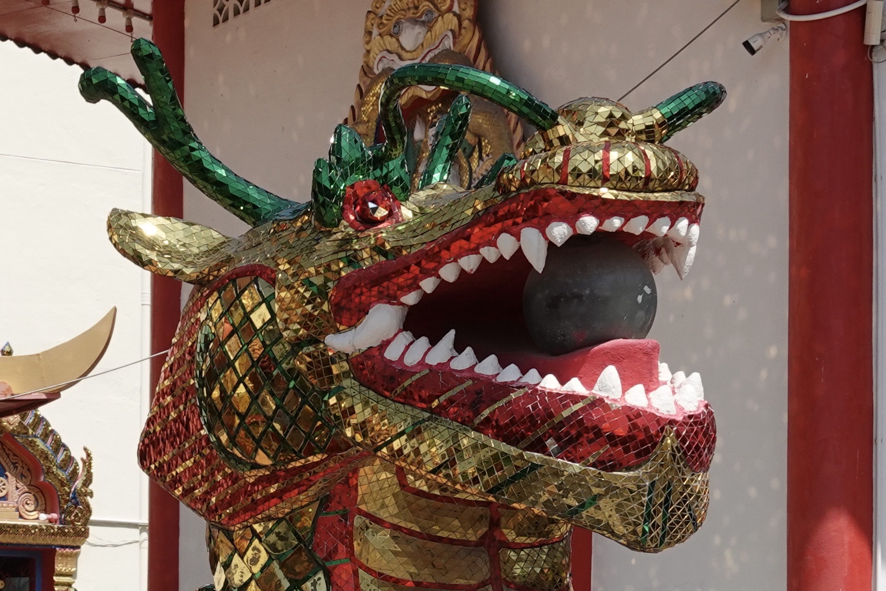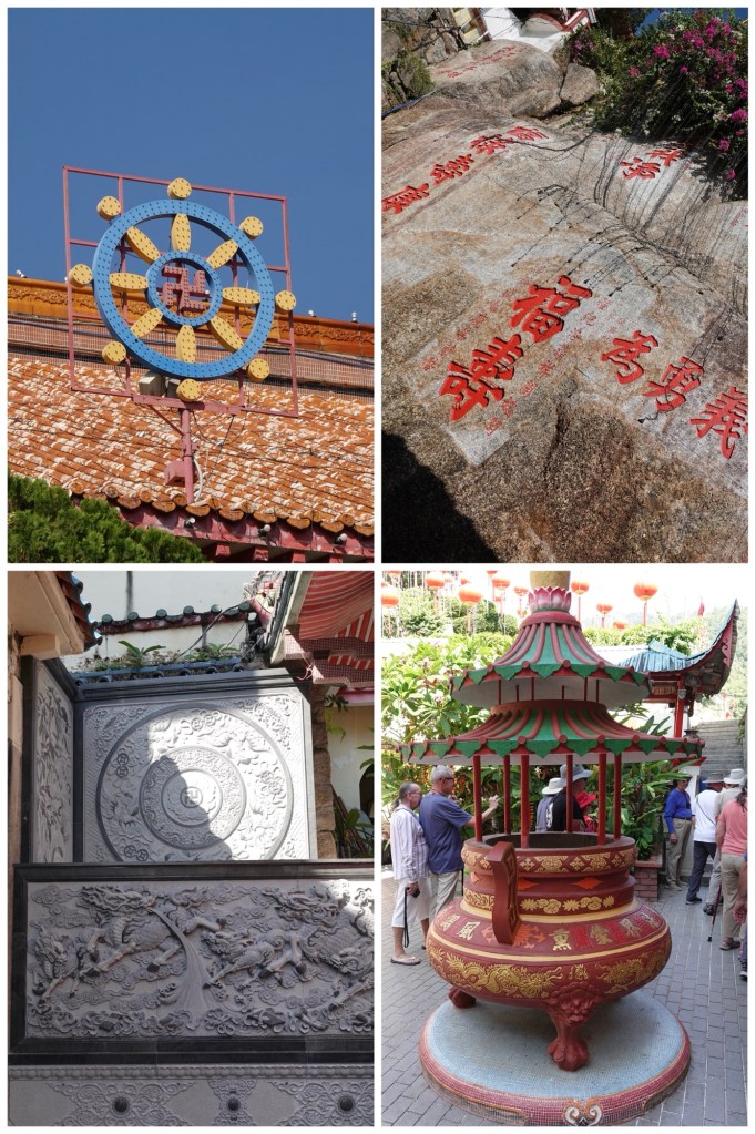 The entrance to the temple features four stunning mirrored glass mosaic Chinese dragons that gleam in the sunlight.There was a sign warning people not to touch them, since the mirror edges can cut.