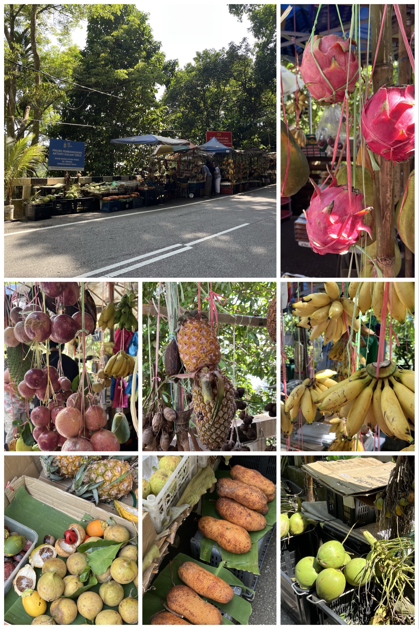Our second last stop of the day was at a local fruit and spice stall in Balik Pulau, where we saw (and smelled) durian, mangosteens (not allowed in hotels because they stain so badly), pineapple, guava, coconut, small gold bananas, dragonfruit, papaya, and … especially … nutmeg. The vendor specialized in nutmeg in all its forms: the exterior (for tea), mace (the nut coating), the nutmeg seed itself, plus nutmeg candy, and nutmeg oil (apparently good for arthritis pain). We bought a bag of the candy and shared it with our bus.