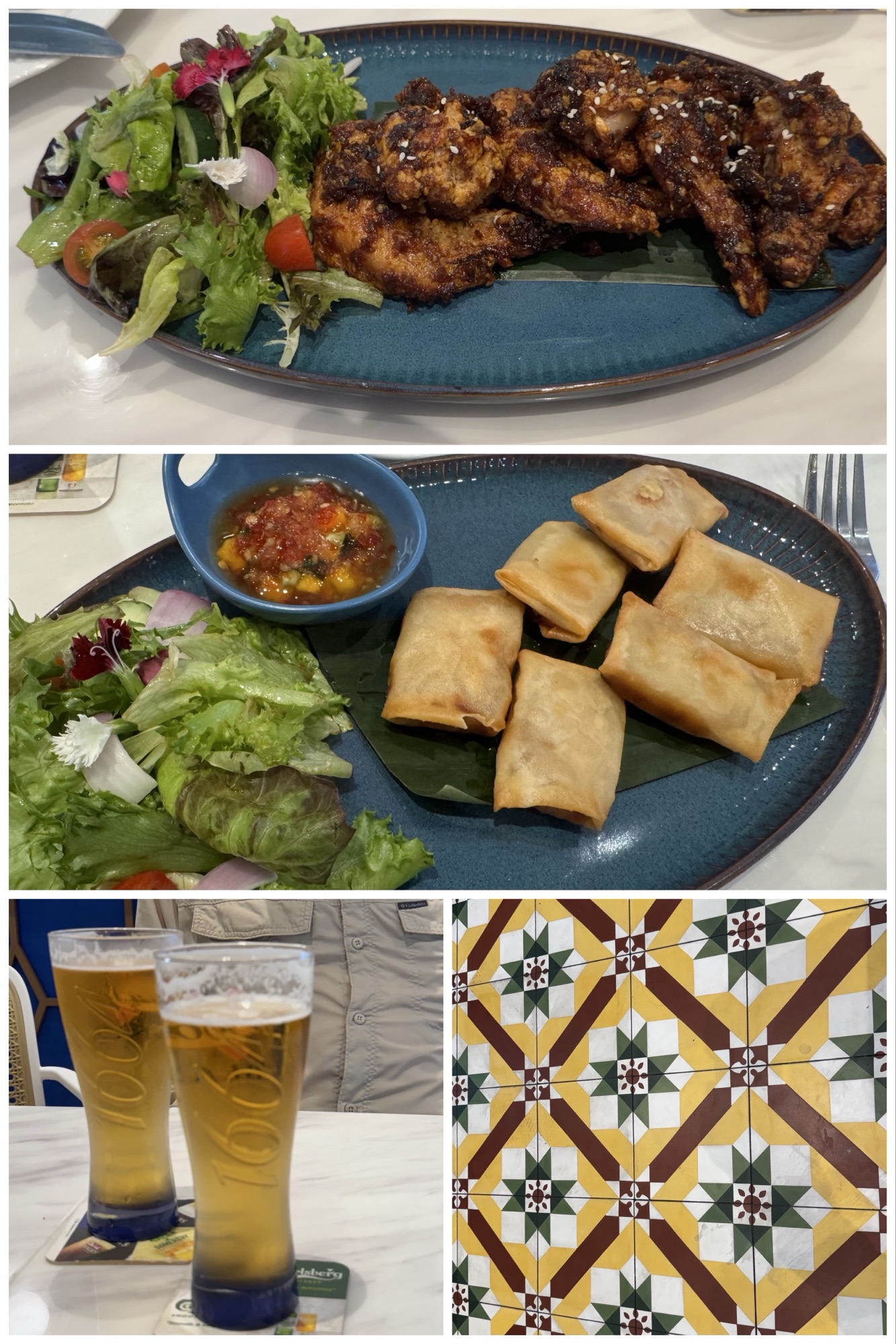 Top: satisfyingly spicy Asian chicken wings. Centre: smoked duck slices wrapped in spring roll papers and served with spicy mango chutney. Our side salads were fresh, lightly dressed, and garnished with tiny edible flowers. Bottom left: 2 pints of Kronenbourg 1664. Bottom right: I was fascinated by the flooring all over colonial centre of Penang, because it looks exactly like the Spanish “pasta tile” used in colonial era Mexican homes.