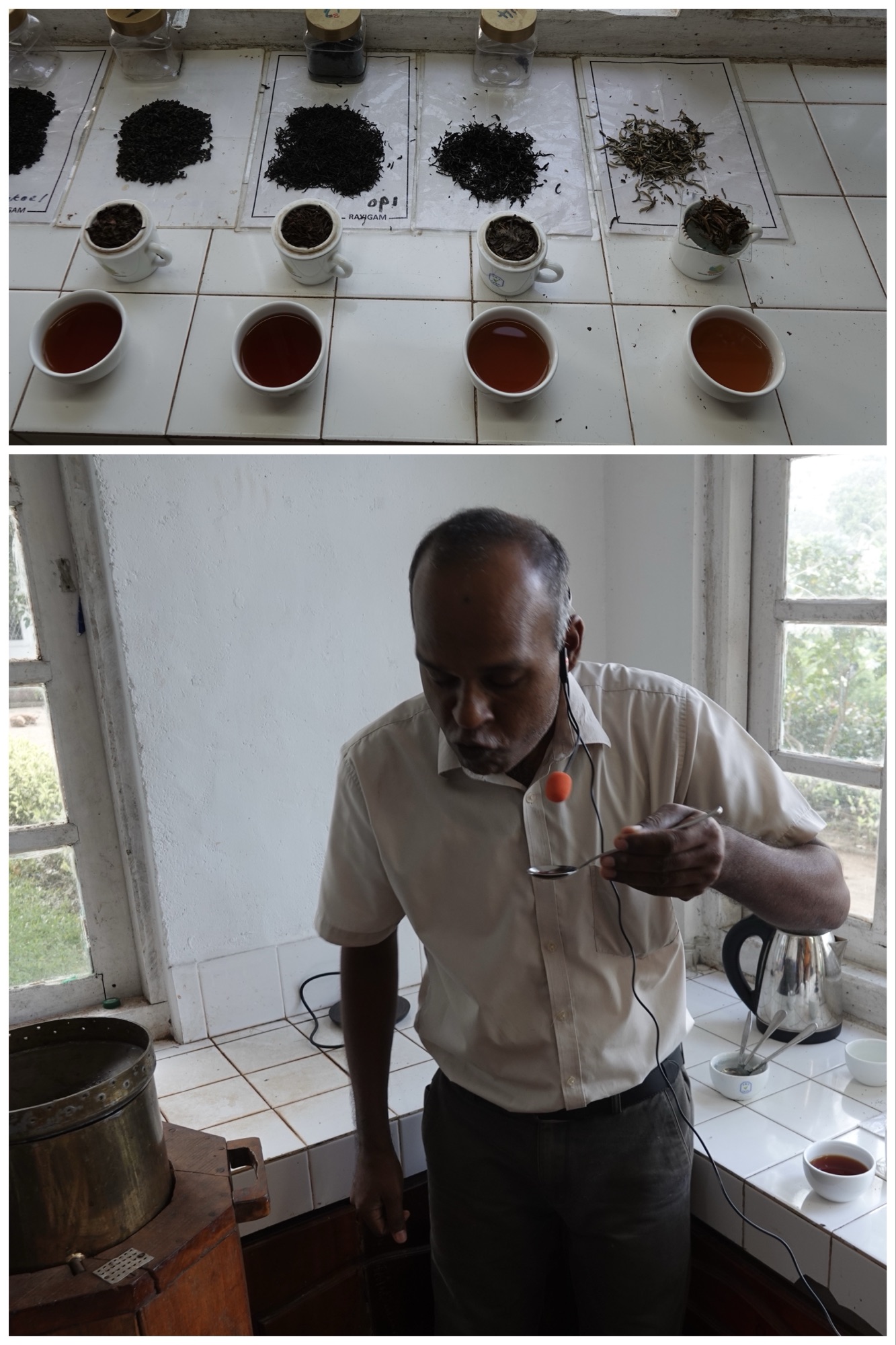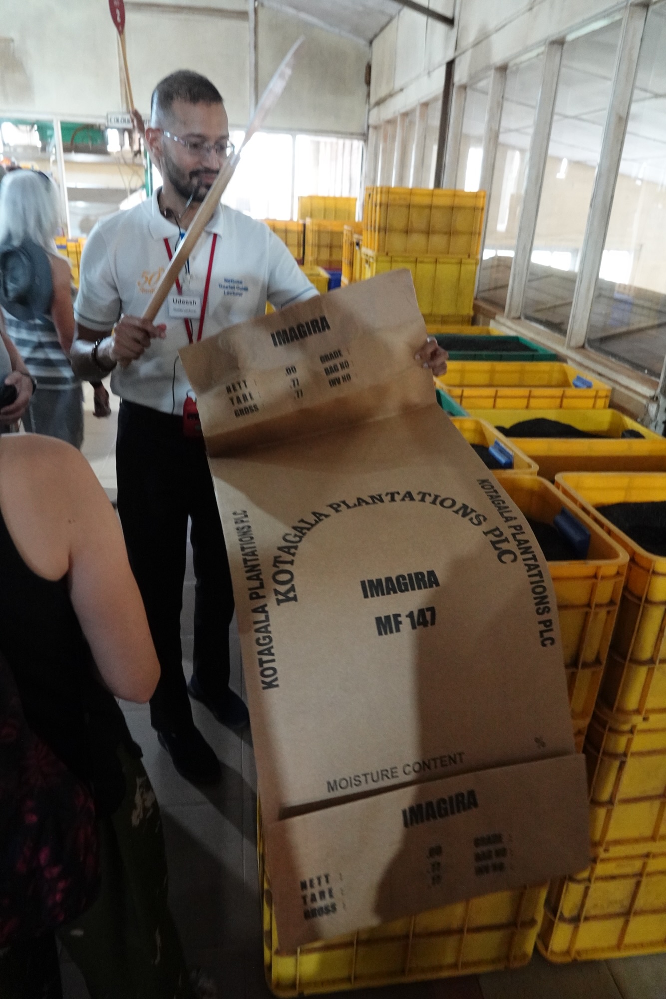 We got to see, but not taste, an array of different tea grades, and watch a (Sinhala) master taster demonstrate how to taste tea, steeping exactly 2.5 grams of leaves in 80 ml of freshly boiled ware for 5 minutes, and then basically swishing and snorting the tea to judge the taste and aroma before spitting it out – a bit like what professional wine tasters do.
