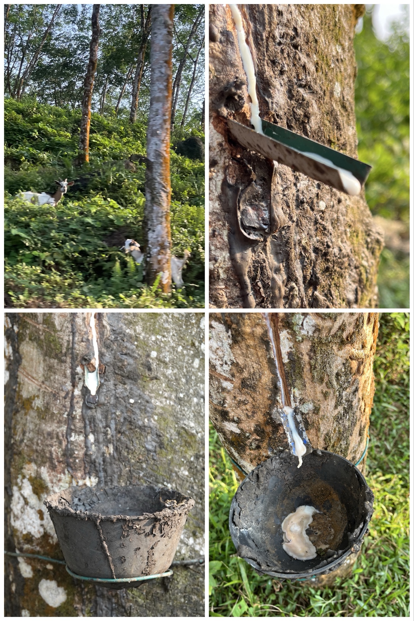 Despite the popularity of synthetic rubber, latex (natural) rubber production is still a significant industry in this area and is essential to the local economy. We were fortunate to see a brief demonstration of the rubber tapping process.