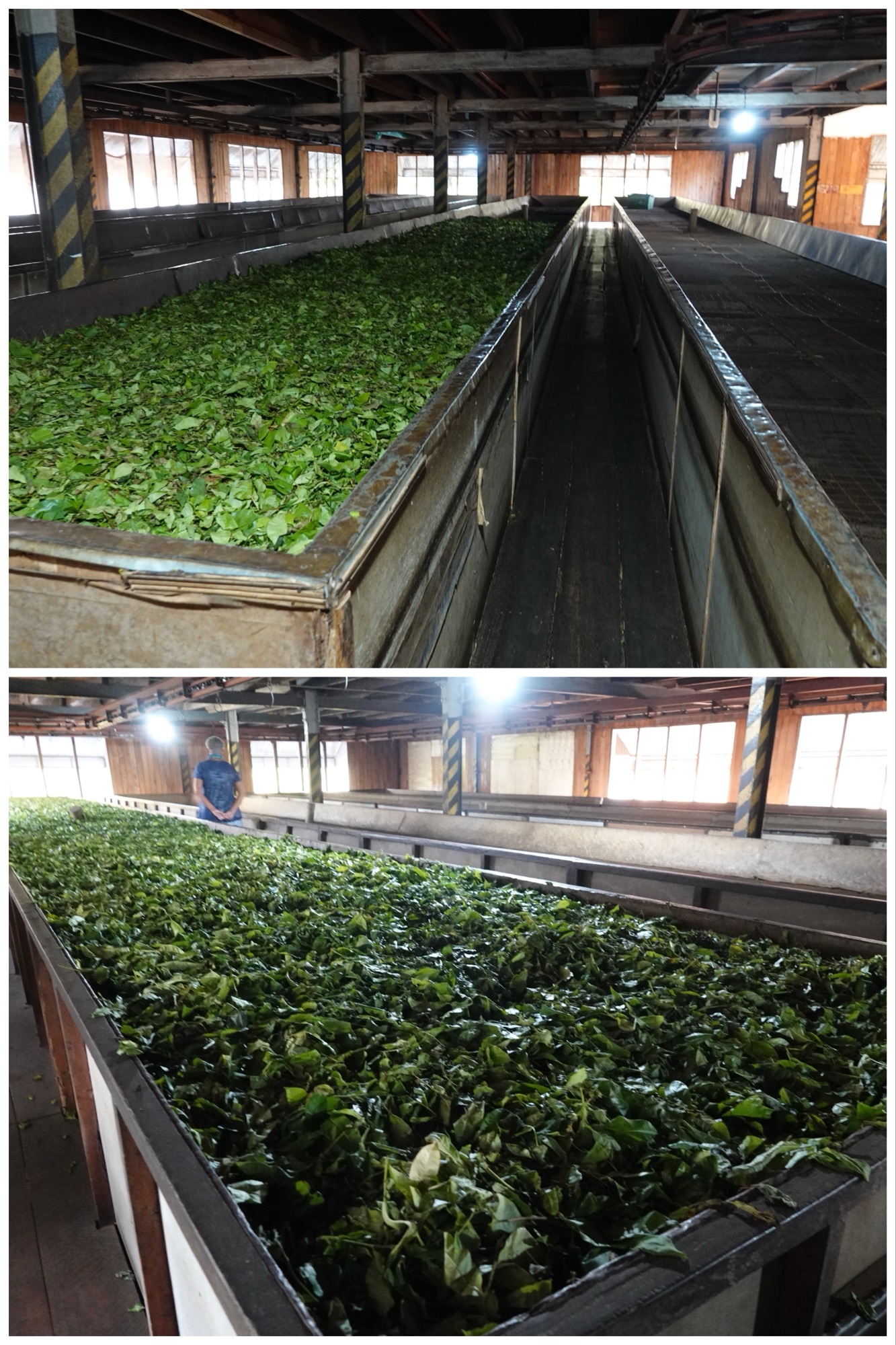 We climbed a fairly steep outdoor staircase to the first floor of the plant, where we saw huge trays of freshly picked tea leaves laid out to dry. This is where they lose up to 80% of their moisture.