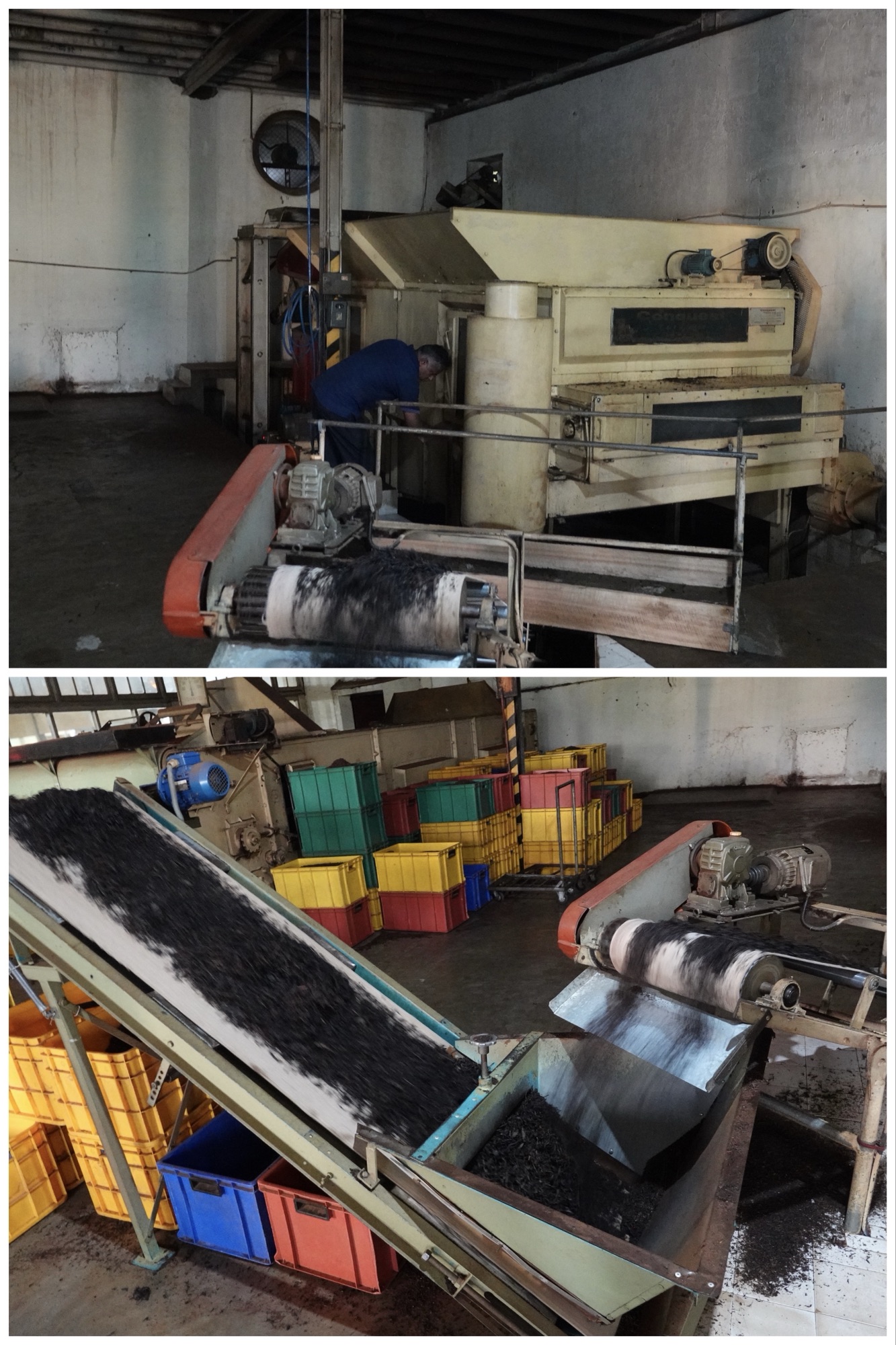 The dry leaves are then gathered into baskets which are given to ladies who empty them by armfuls into a square tube (think laundry chute) that drops them into a rolling machine on the ground floor.