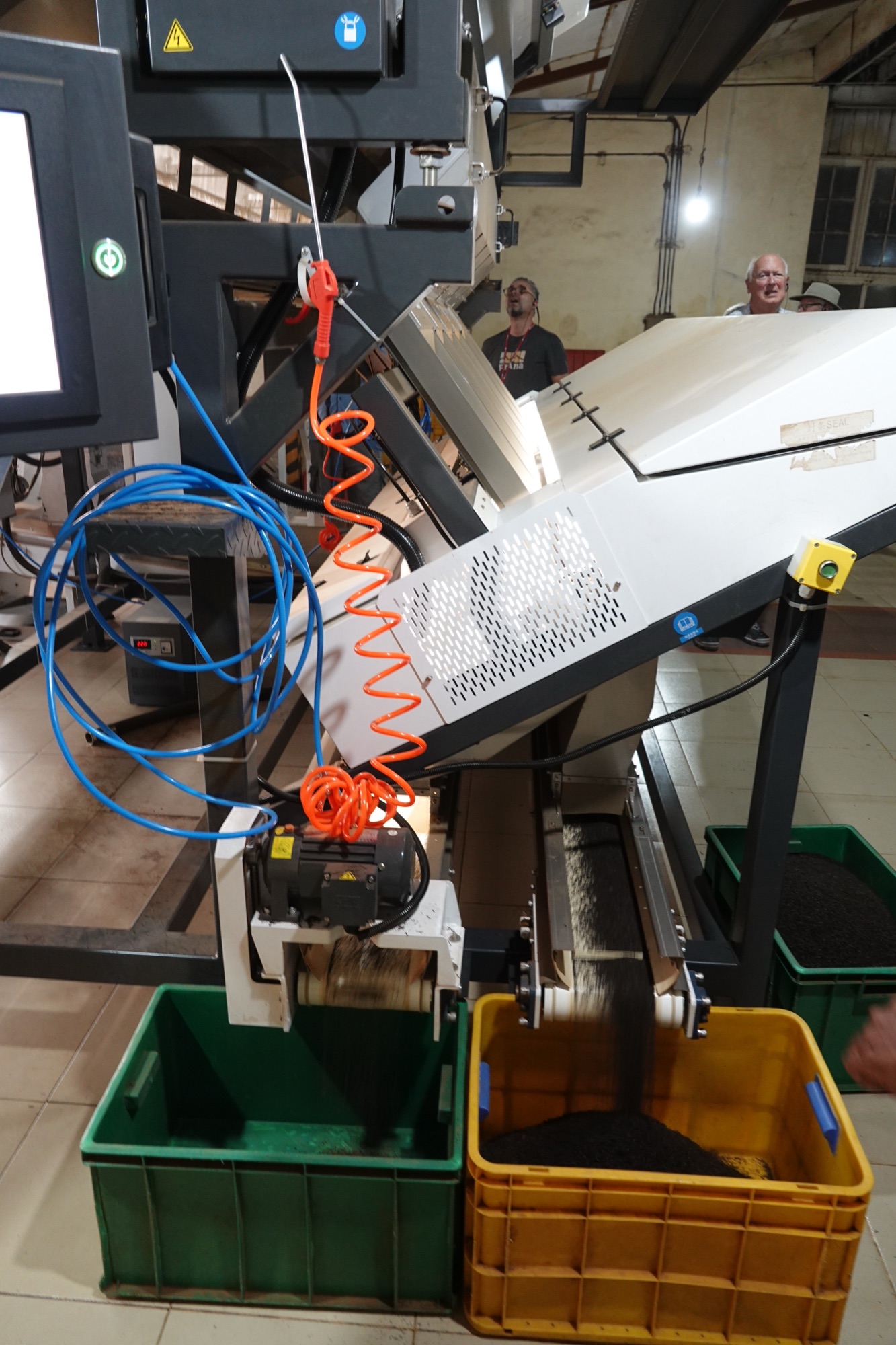 Next they go to a “colour sorter”. No one explained exactly how that worked, but the rolled tea leaves were dispensed into yellow, blue, and red bins – and they really were different colours. One of the bins was “refuse” – leaves unsuitable for commercial sale.