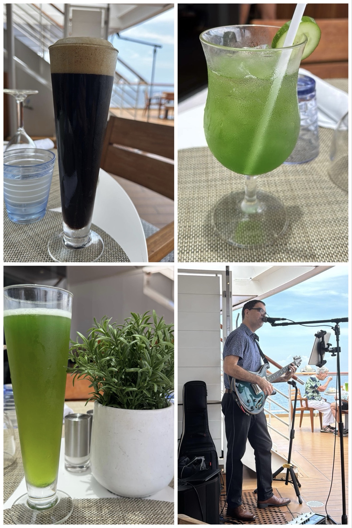 Trying to be considerate of fellow cruisers meant that, even though I was masked, I only popped into the St. Patrick’s Day event on the Aquavit terrace long enough to admire the display, and have a quick green drink and and some food at an outdoor table with Ted. Sadly, that meant Ted was on his own for dessert and Allan’s guitar accompaniment to the event.