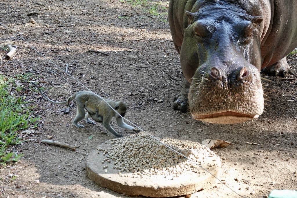 The monkeys were even brave enough to steal bits of the hippos’ food.