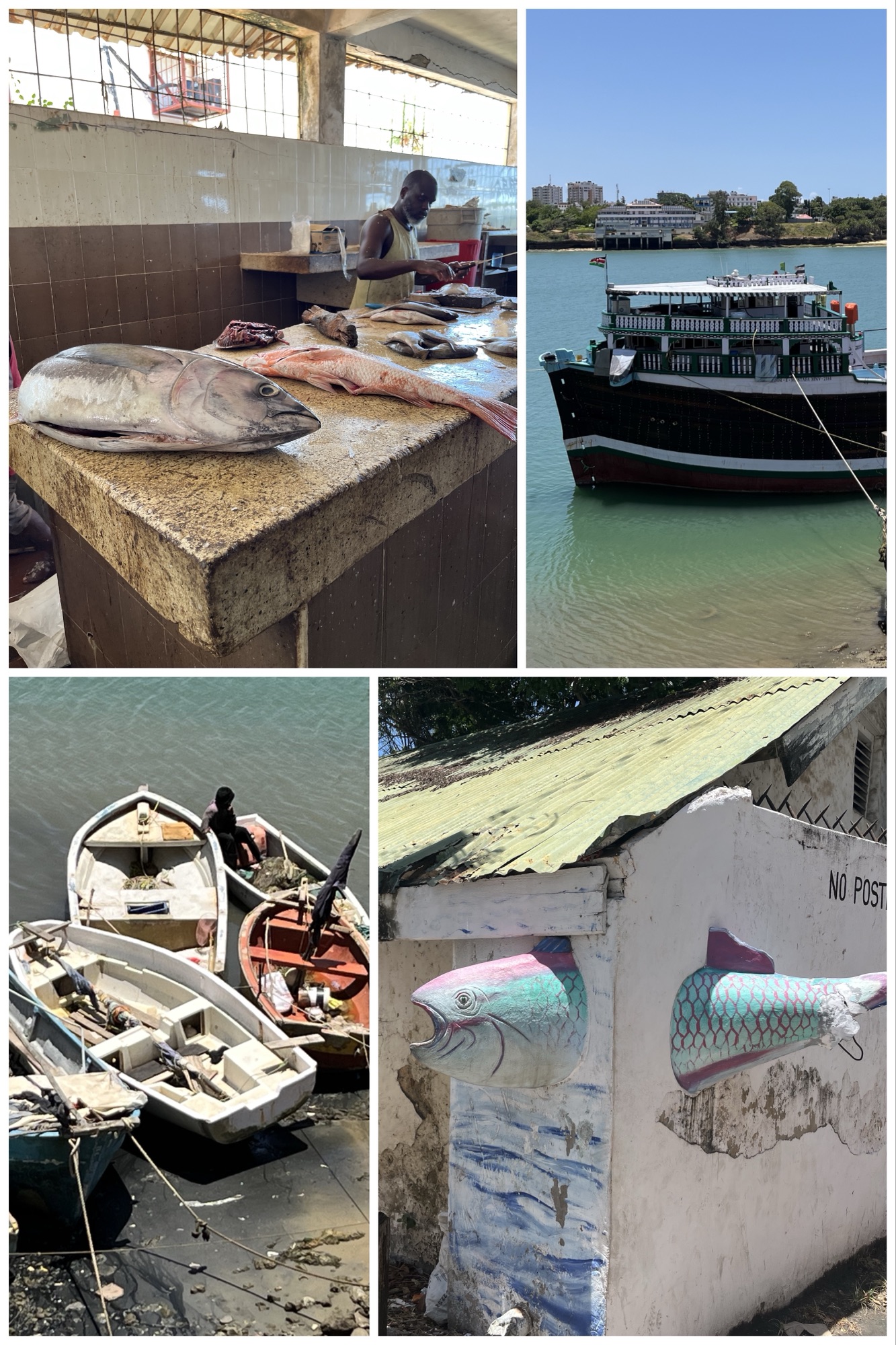 Most of our group, including Ted, were too hot and exhausted by then to take the planned walk through Mombasa’s Old Town, but the 8 of us who went got a glimpse of narrow alleys, stores topped by apartments with 13th century-style Arabic balconies (reminiscent of what Ted and I had seen in Yanbu Saudi Arabia), artisan shops, and a local fish market.