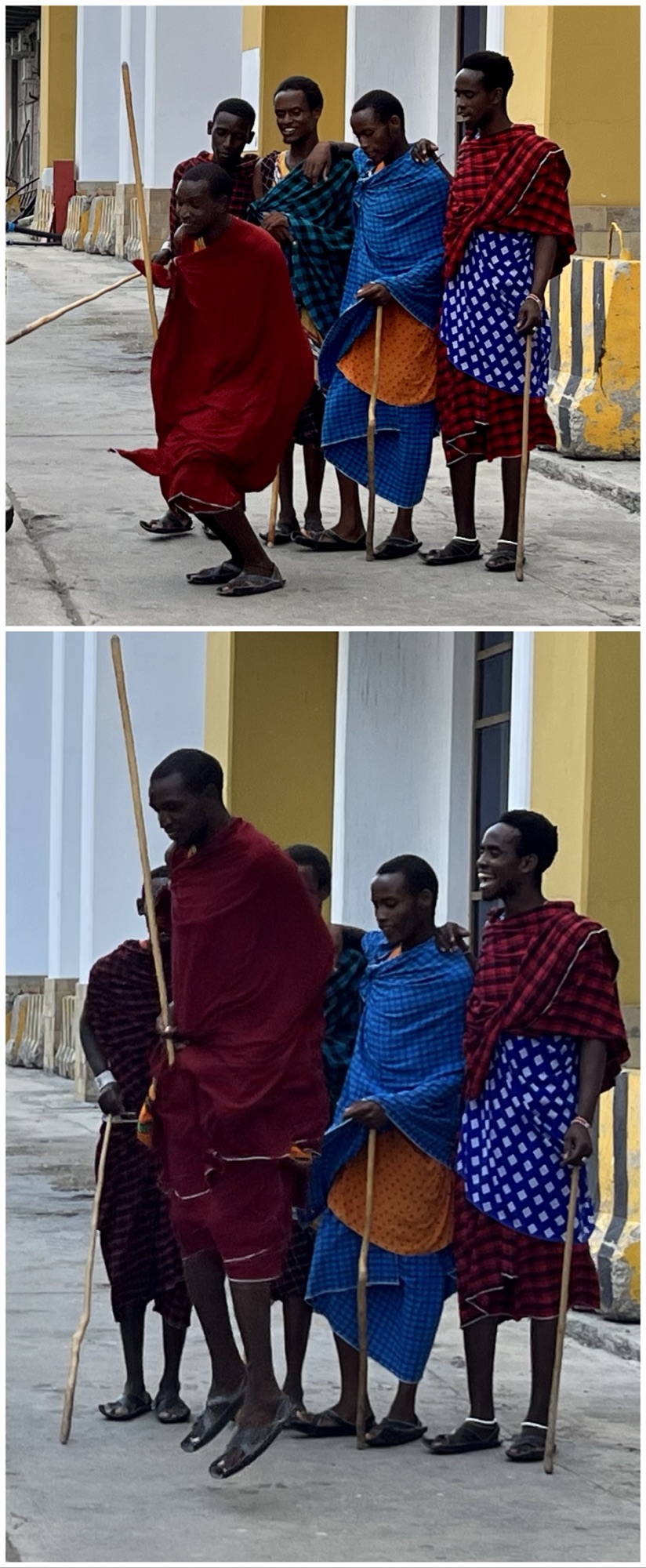 As we re-boarded our ship, a group of young Maasai men honoured us with an adumu, also known as the Maasai jumping dance, a type of dance that the Maasai people of Kenya and Tanzania practice. Young Maasai warriors generally perform the energetic and acrobatic dance at ceremonial occasions including weddings, religious rites, and other significant cultural events.