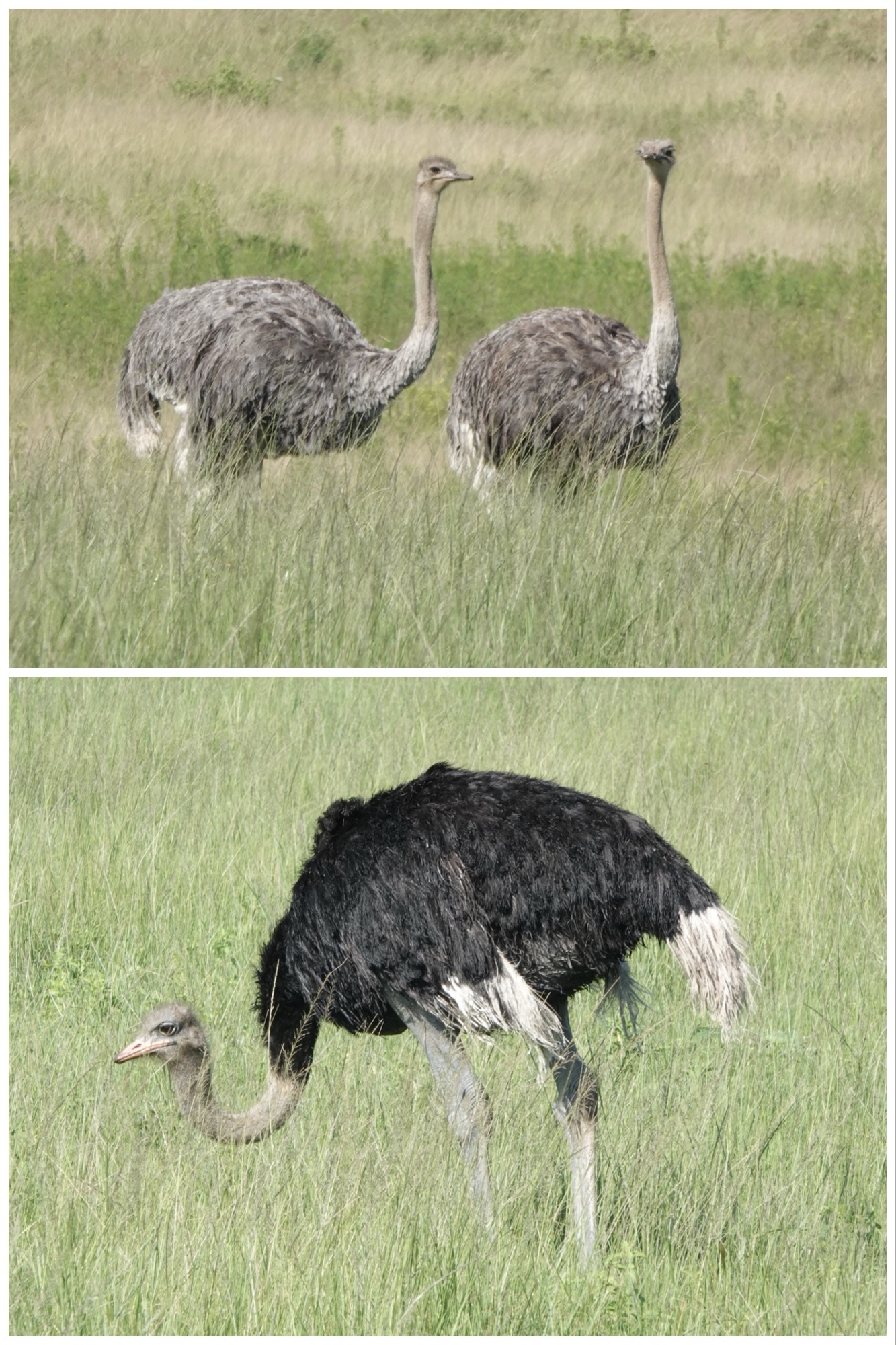 9:20 a.m. Tall ostriches in the tall grass.The grey feathered ones are females; the black and white is a male.