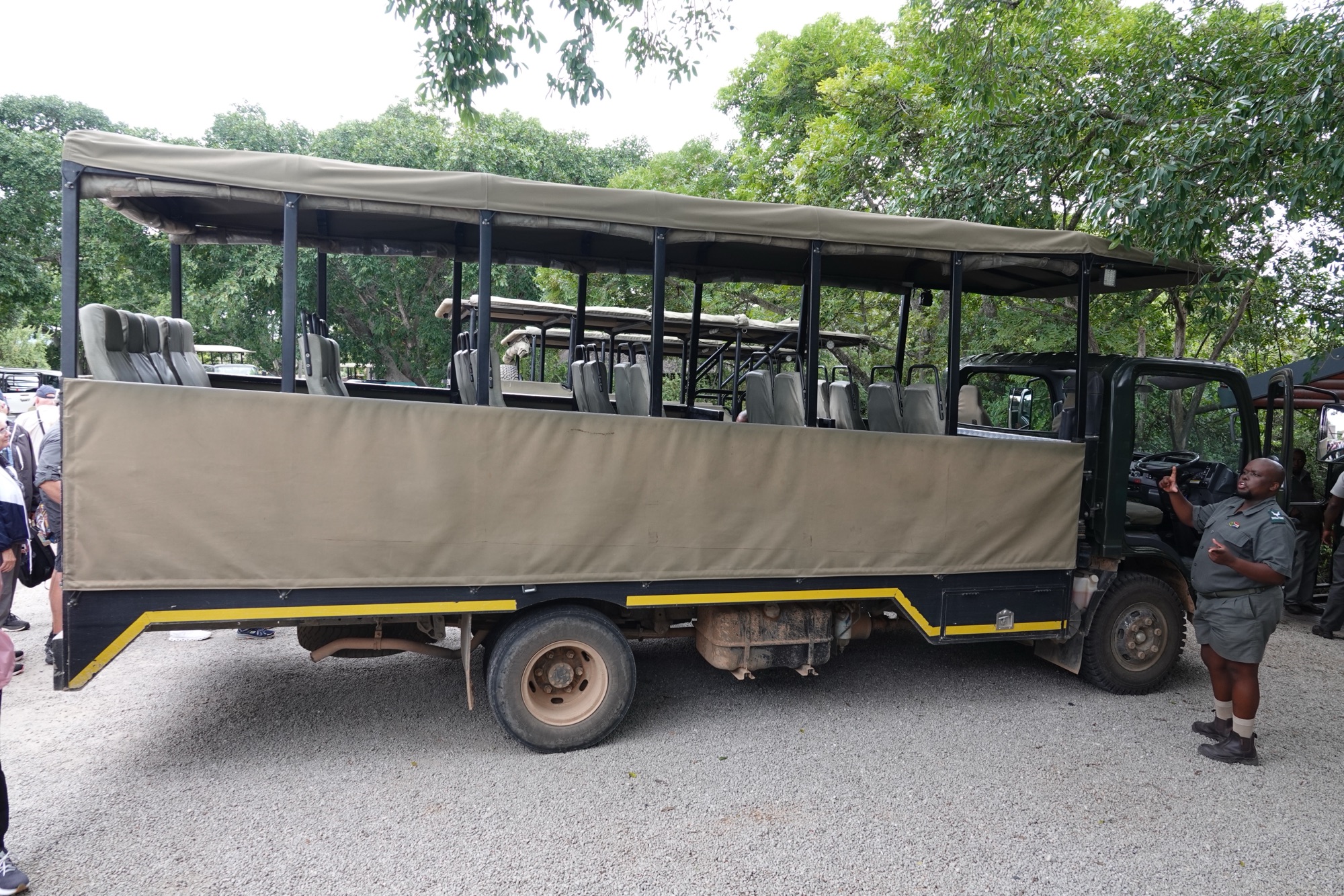 At the park we boarded an open, canvas-roofed 4×4 vehicle seating 24 (the vehicles have gotten progressively bigger with each safari) for our guided tour on a well-maintained network of roads. This was a very different experience than driving across the veld at Tala Reserve in Durban, off-road through Zulu Nyala in Richards Bay, or even at Tsavo in Mombasa.