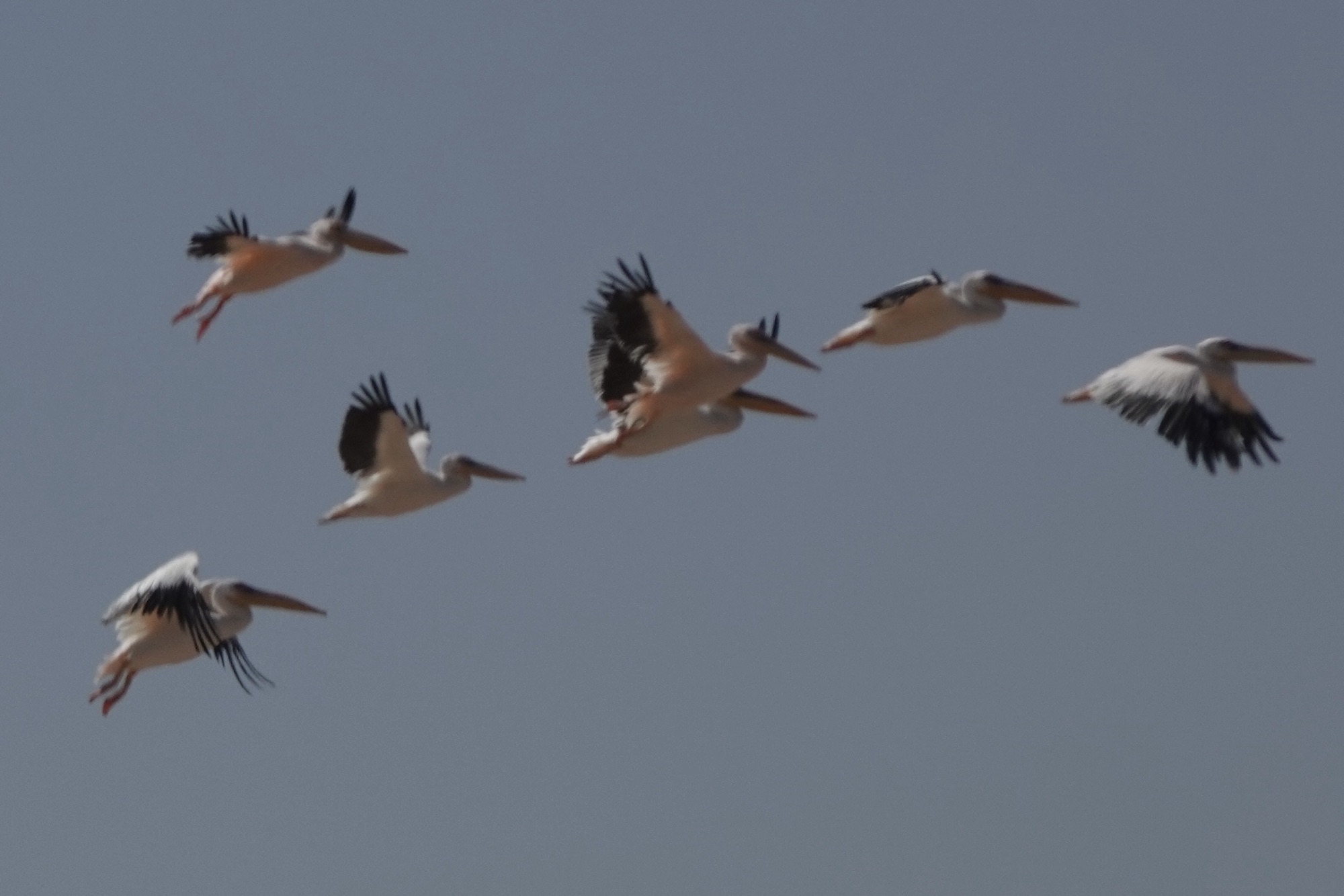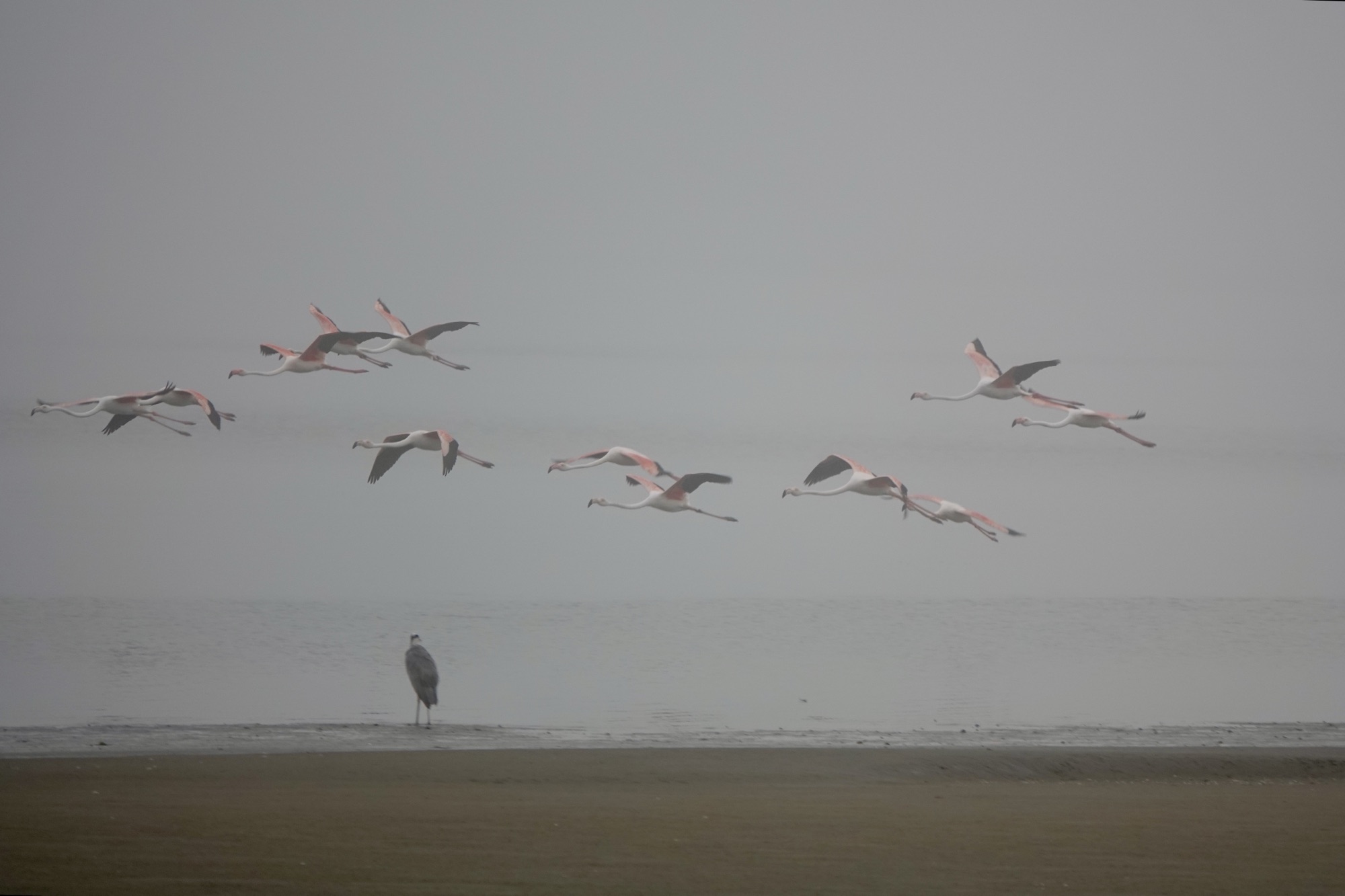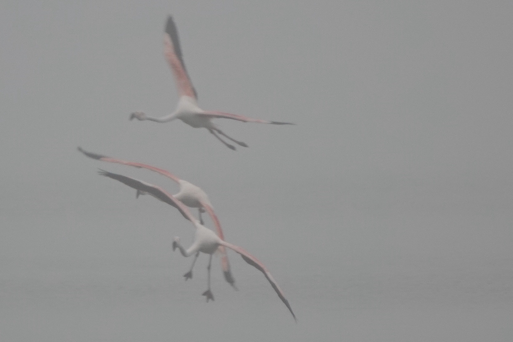 Our goal was to admire the lagoon’s famed pink flamingoes. More remarkable, to me anyway, were the pinkish-white pelicans! The tide was out, and both were far out on the wet sand, with their colours further washed out by the continued heavy fog.