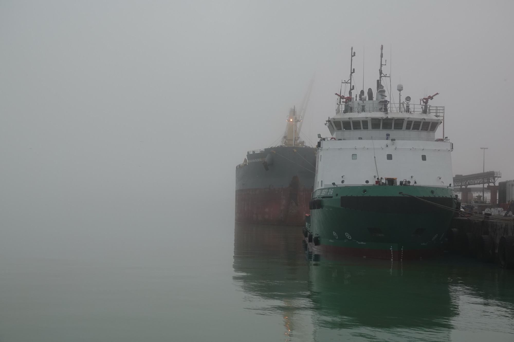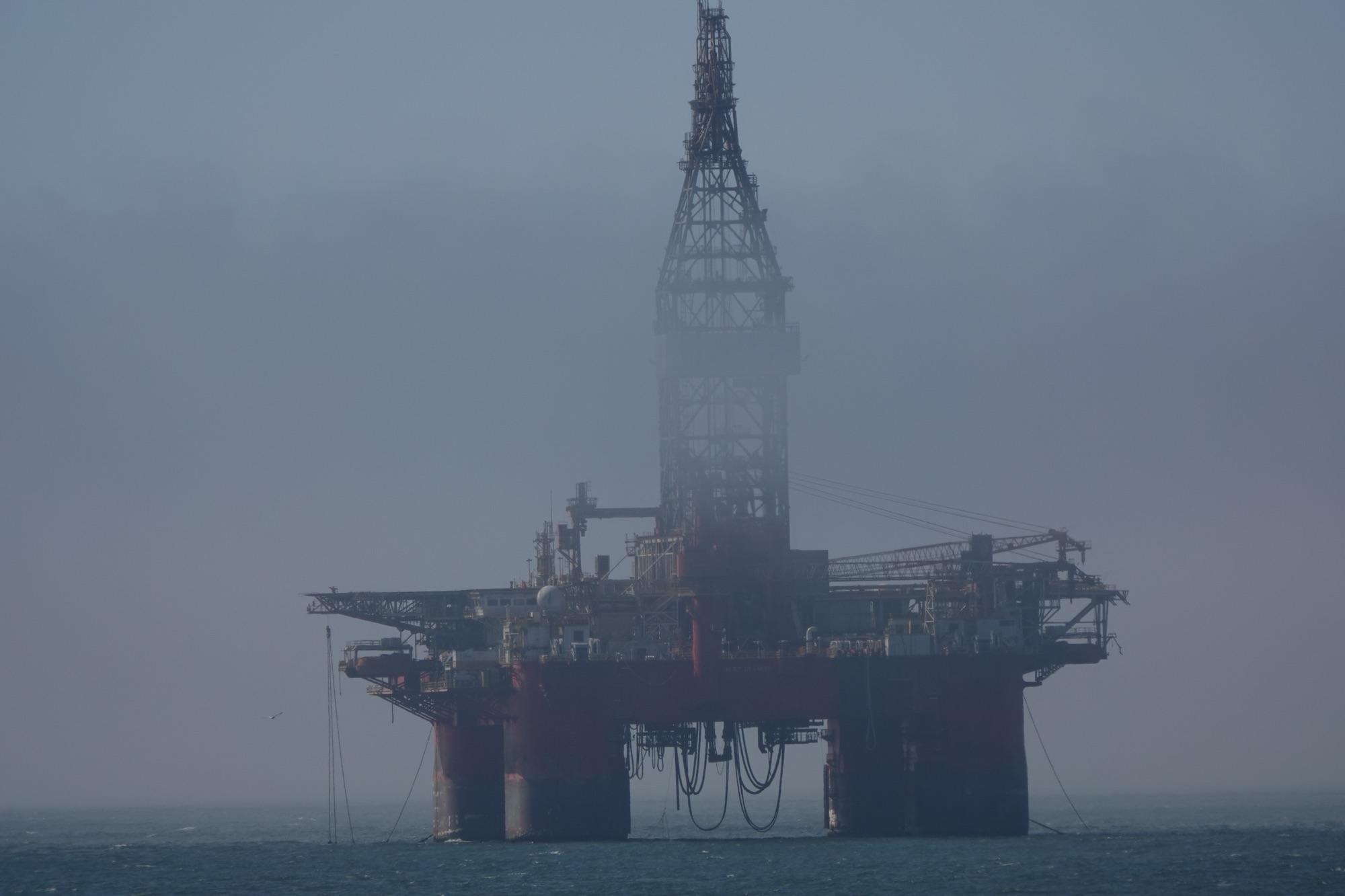 Shortly after leaving Walvis Bay, light fog started to roll in off the cold Atlantic waters, and we glimpsed a fog-shrouded oil rig not far off our starboard side.